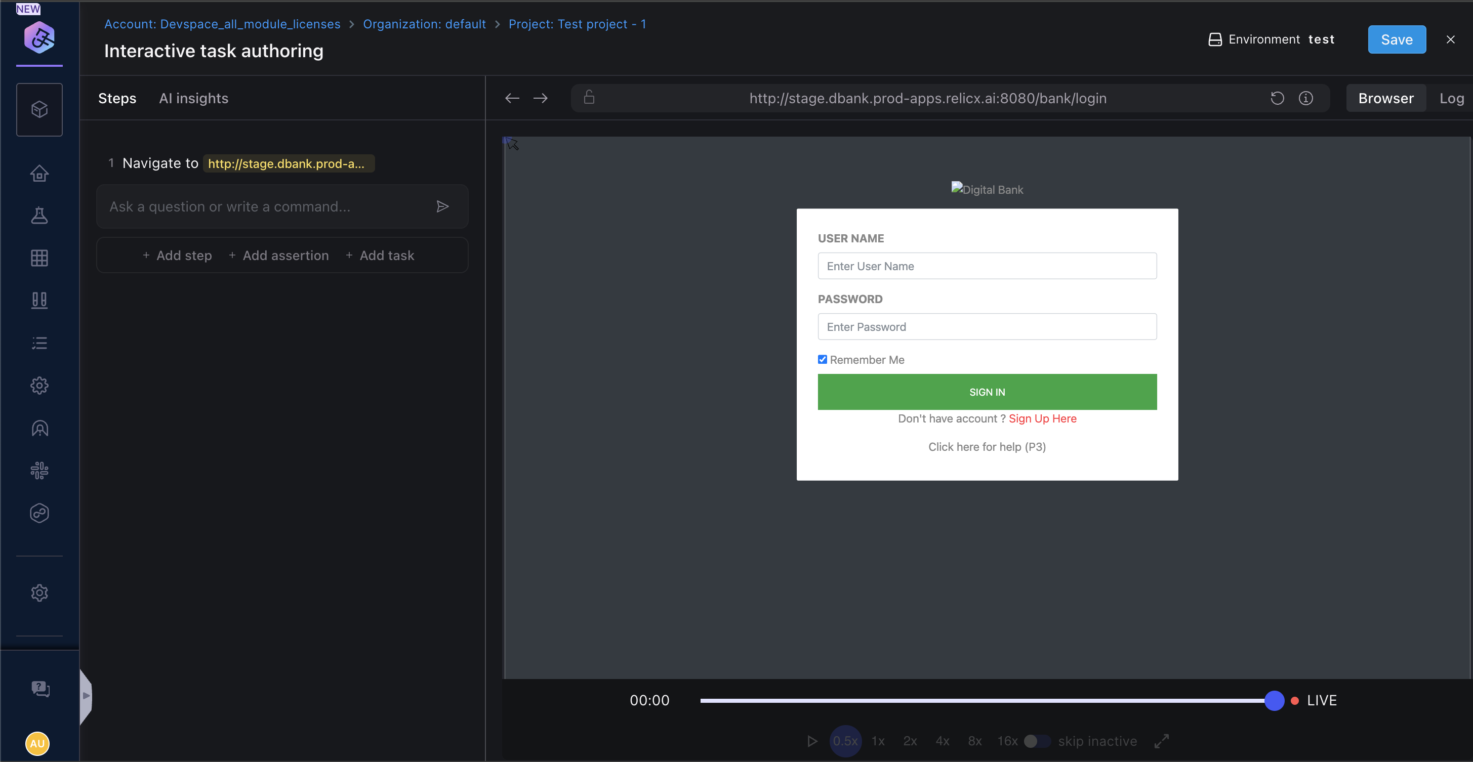 If your application requires authentication, you may wonder how can you avoid adding the login steps into your test every time. Harness AI Test Automation provides the ability to add a login task that is automatically called when a test is either created or executed. You just need to create it once and add your login credentials;