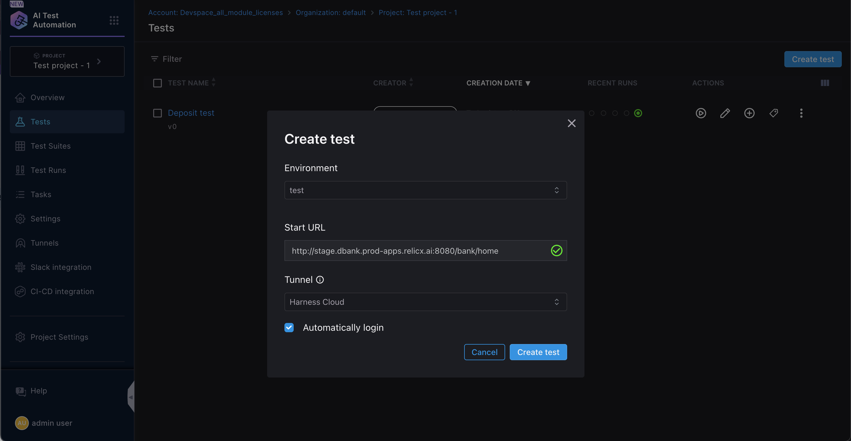 Select the project where you want to add your tests. If one doesn't exist then create a new project. Once a project is created and you select AI Test Automation, you will be prompted to add your test environment