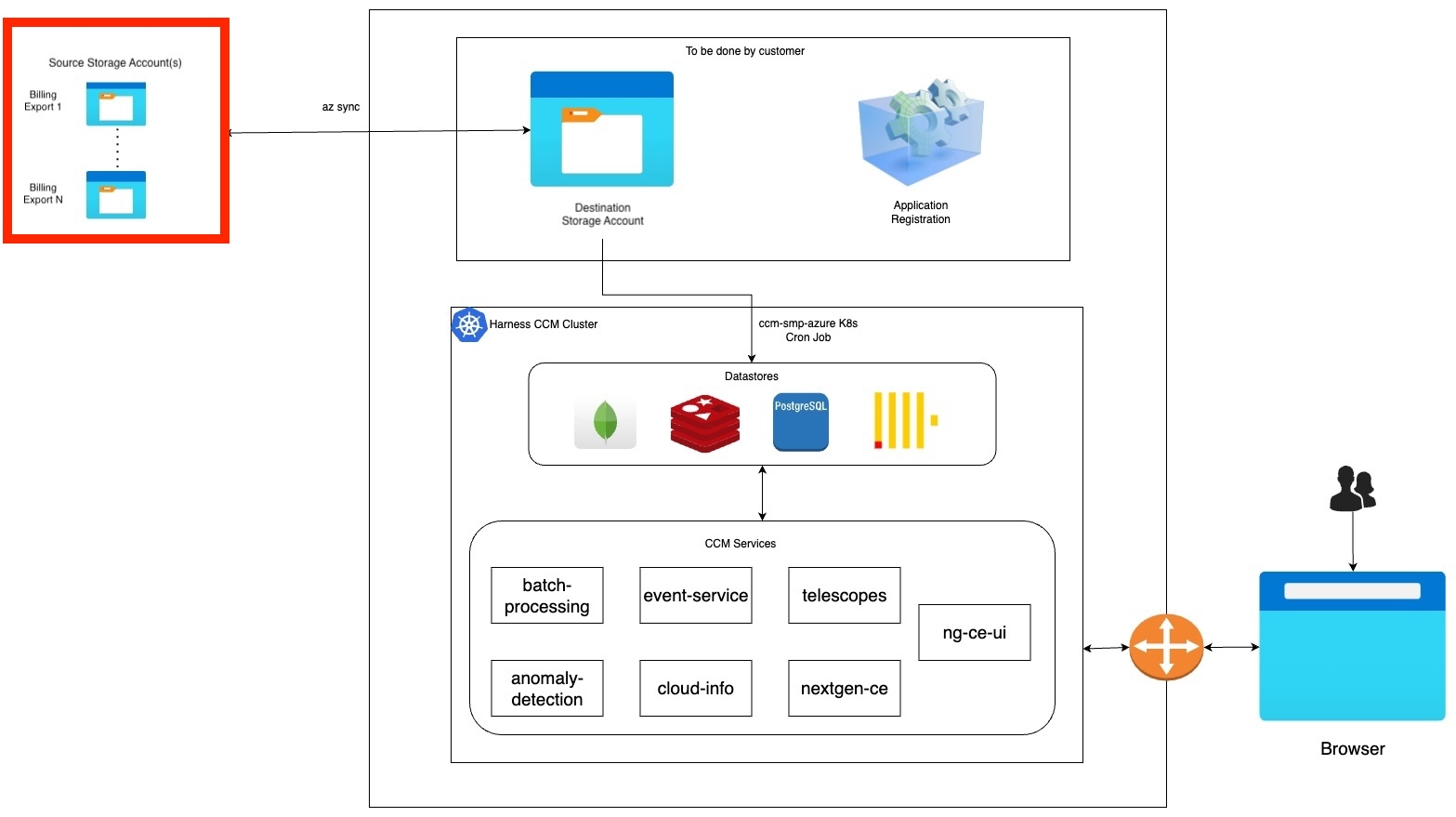 The flow at a high level works similarly to our SaaS environment. We support syncing data from multiple Azure account exports residing in different source storage accounts into CCM via a destination storage account (staging).