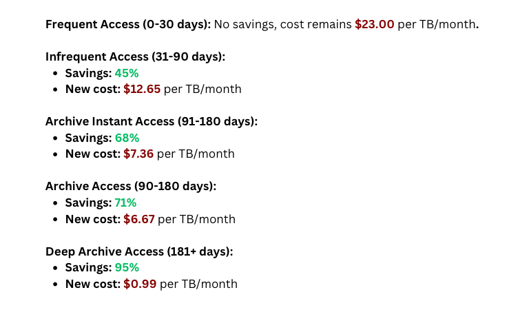 If 20% of your data transitions to the Infrequent Access tier after 30 days, 20% moves to Archive Access after 90 days, and 10% moves to Deep Archive Access after 180 days, your costs might look like this: