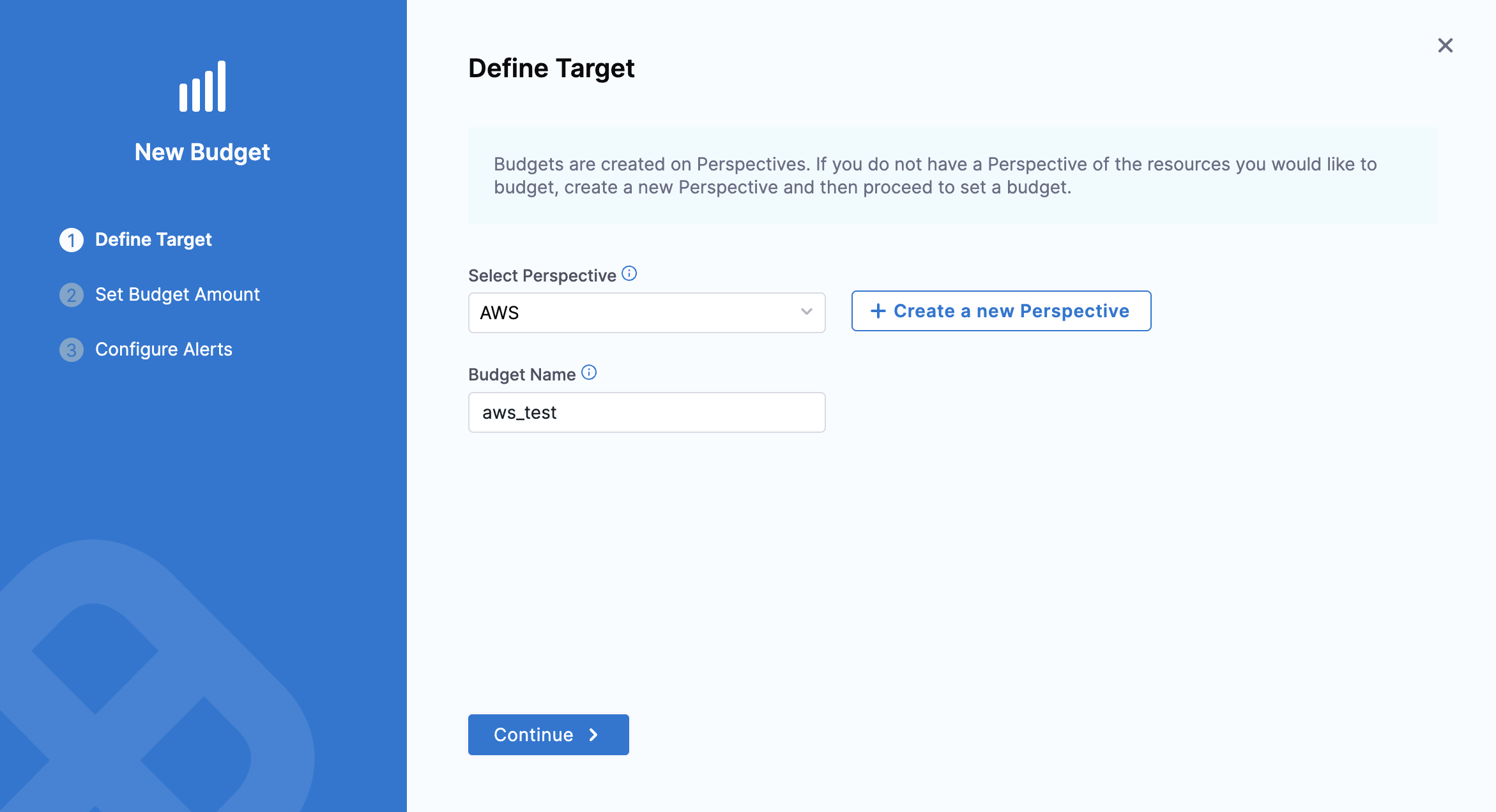Budgets are created on Perspectives. If you do not have a Perspective of the resources you would like to budget, first create a new Perspective and then proceed to set a budget. You can add multiple budgets for a single Perspective. -
