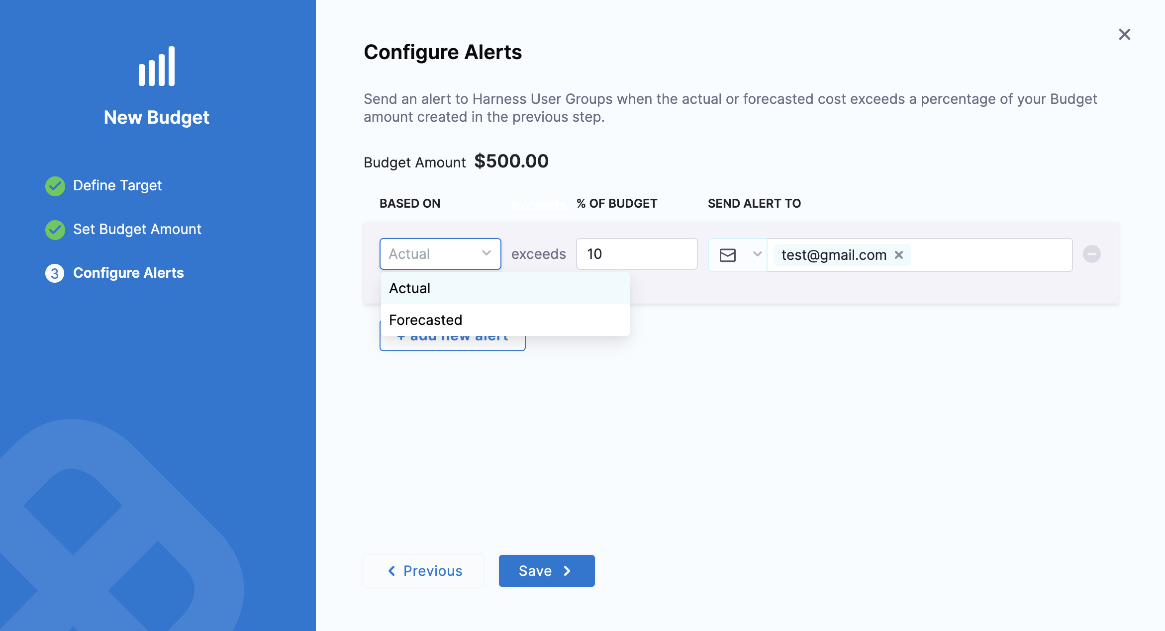 - Specify the Percentage of Budget based on the Actual Cost or Forecasted Cost. Harness sends alerts when the Actual Cost or Forecasted Cost exceeds the threshold.