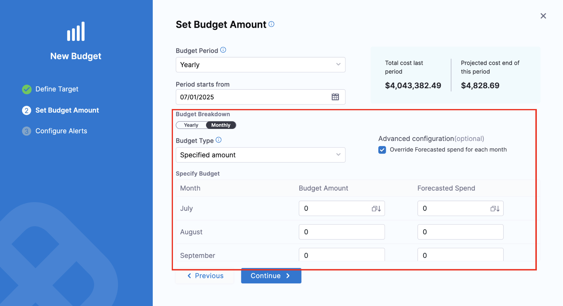 - Monthly: Individual budget amounts for each month of the year, with the option to override forecasted spend for each month.