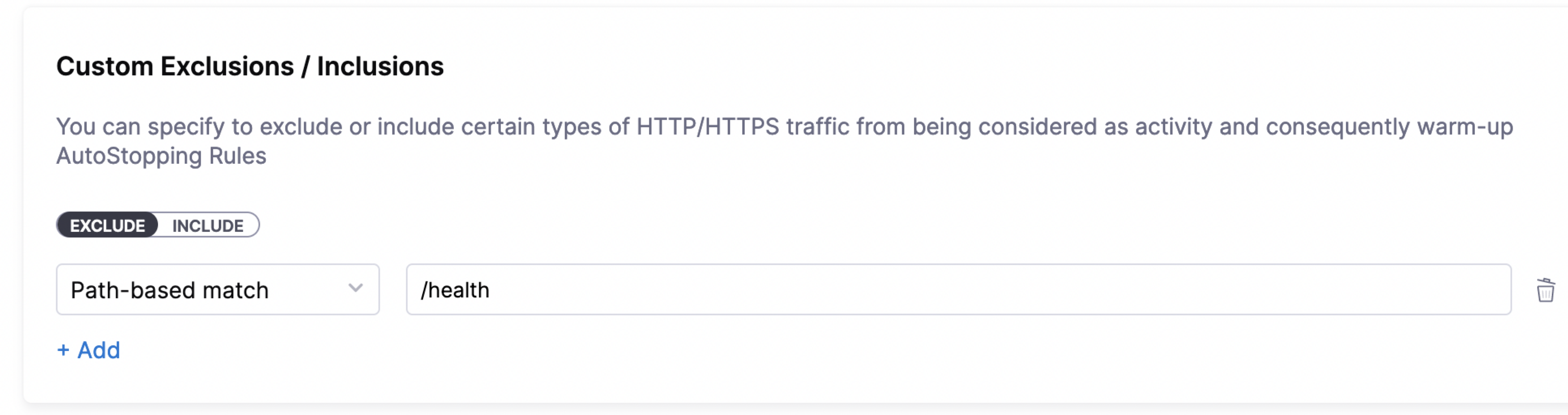 Custom exclusions and inclusions allow you to keep the cloud resources managed by AutoStopping remain idle by defining rules. These rules prevent the cloud resource from detecting traffic by the AutoStopping rule. For example, you can use custom exclusions and inclusions to filter out repeated traffic such as health checks, which would otherwise keep the cloud resource active at all times. The minimum idle time for the exclusion or inclusion-enabled AutoStopping rule is 15 minutes.