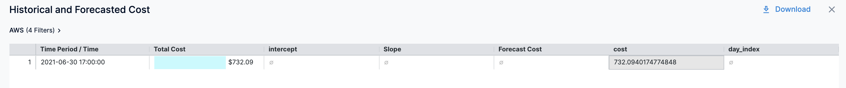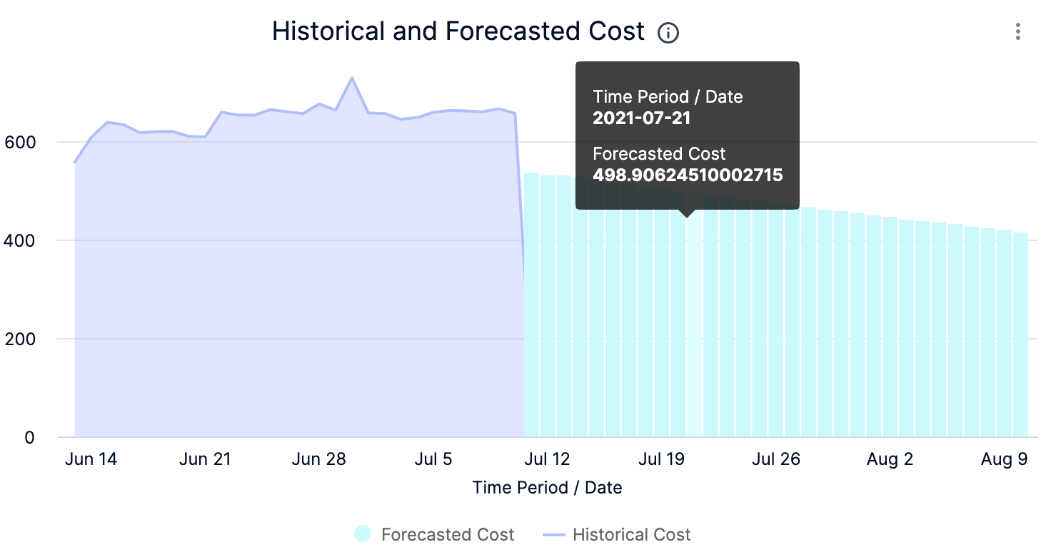 Historical and Forecasted CostThe historical and forecasted AWS cost. Forecasted cost is the prediction based on your historical cost data and it is predicted for the same future time period as your selected time range.
