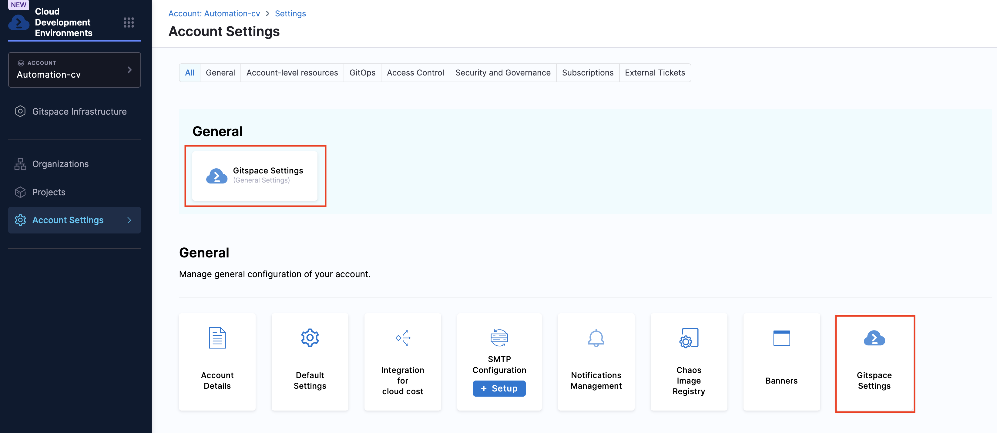 1. You must have account-level access to configure Gitspace settings. These settings are only available at the account level.
