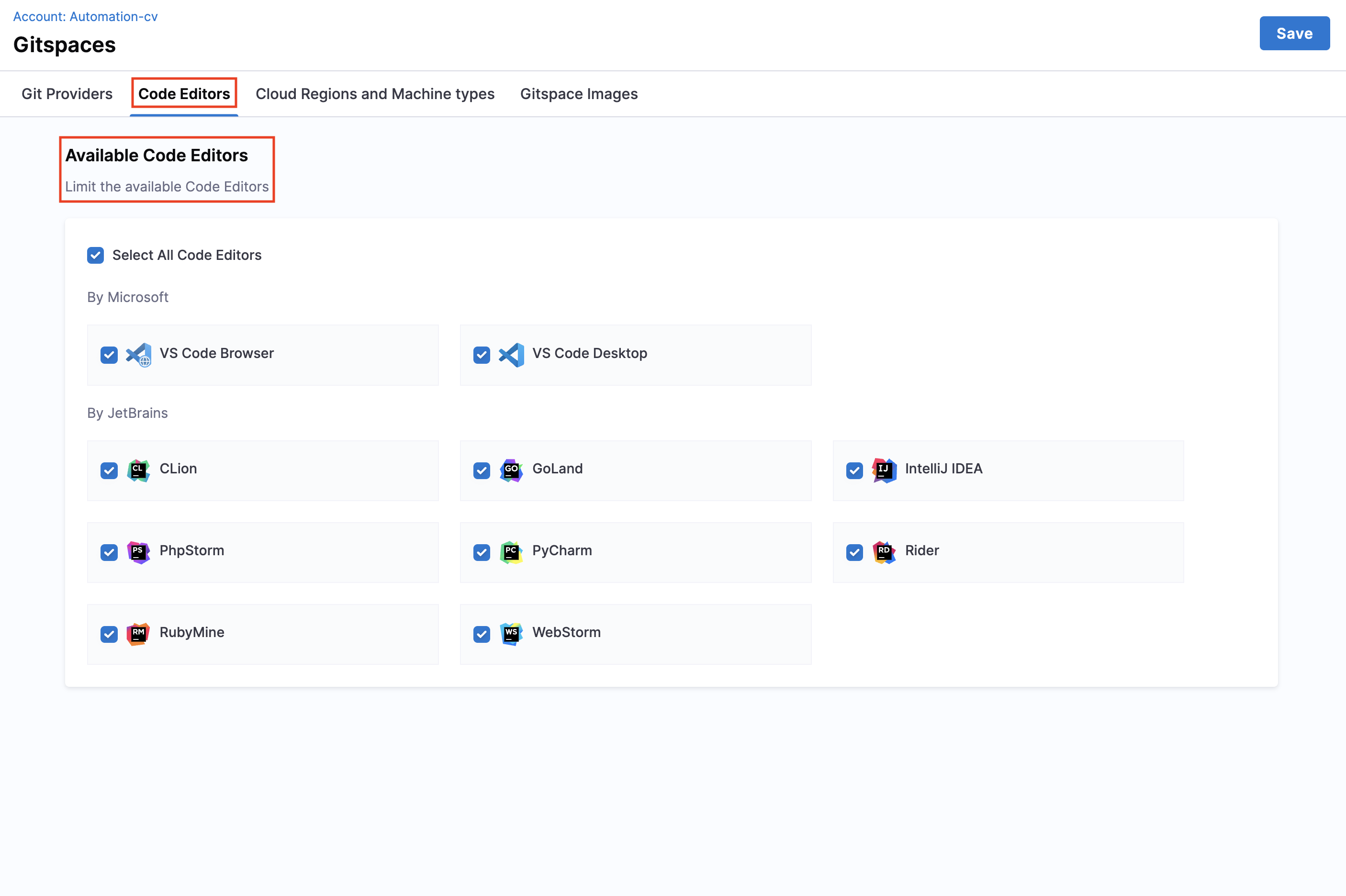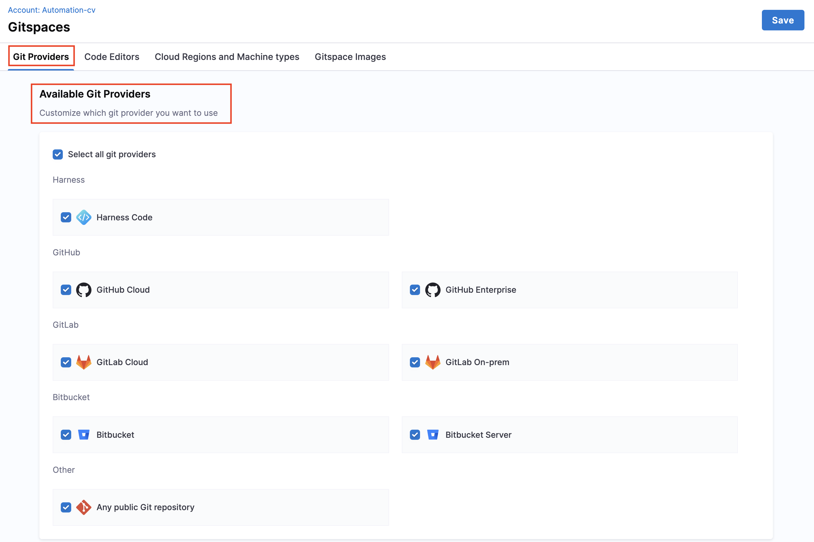 Use this setting to restrict and manage which Git providers are available for your account’s Gitspaces. Once configured, CDE users will only be able to create Gitspaces with the specified providers. Click Save to apply your changes.