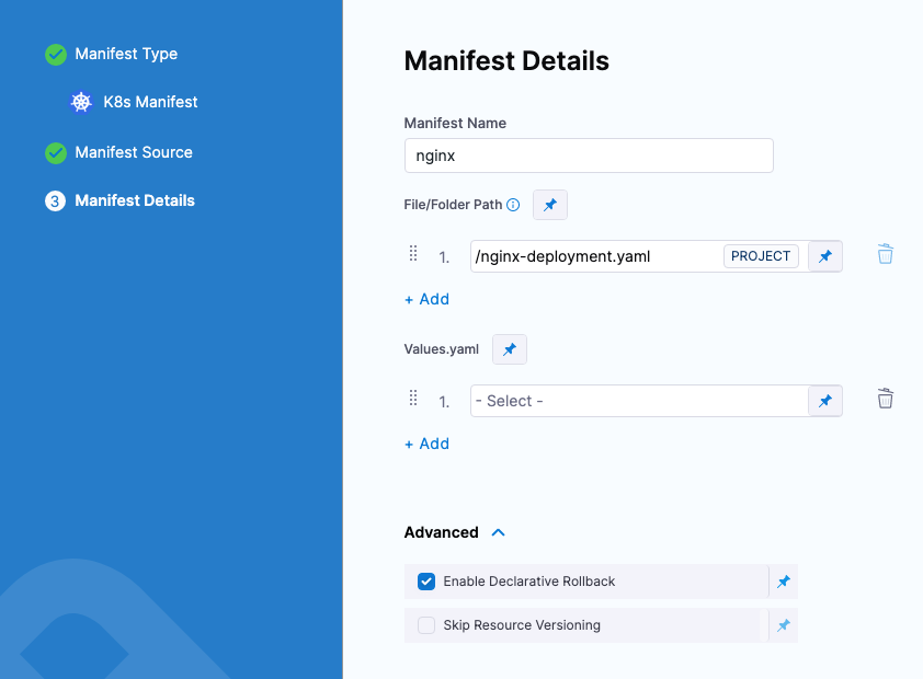 To enable declarative rollback, configure the following Harness service options. These options are defined in the service because they are tied to the service's manifests.