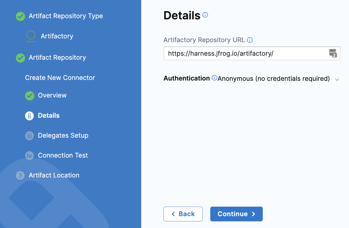 Click Continue to connect with Artifactory by using a Harness Delegate.