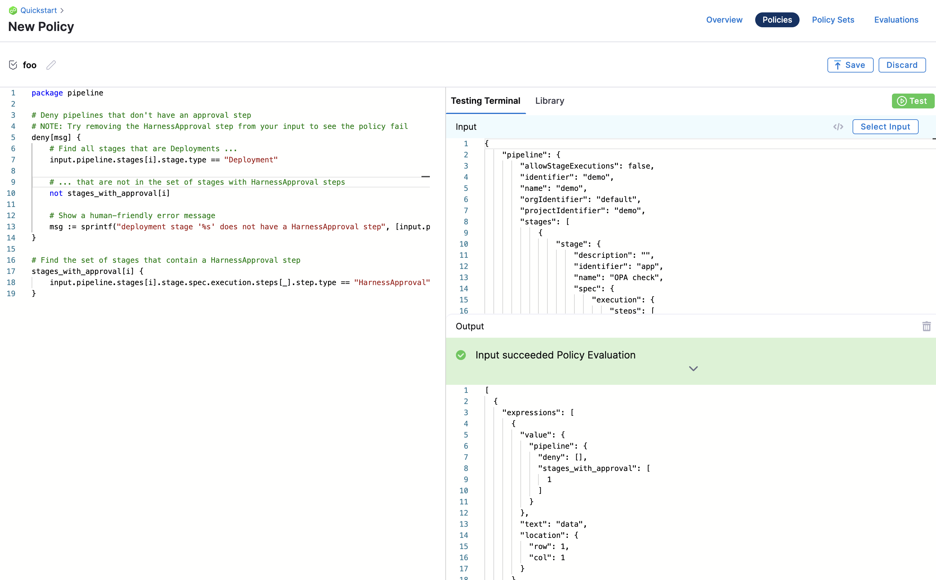 The Policy step in a Pipeline also enables evaluating policies during Pipeline execution. Go to add a Governance Policy step to a pipeline for more information.