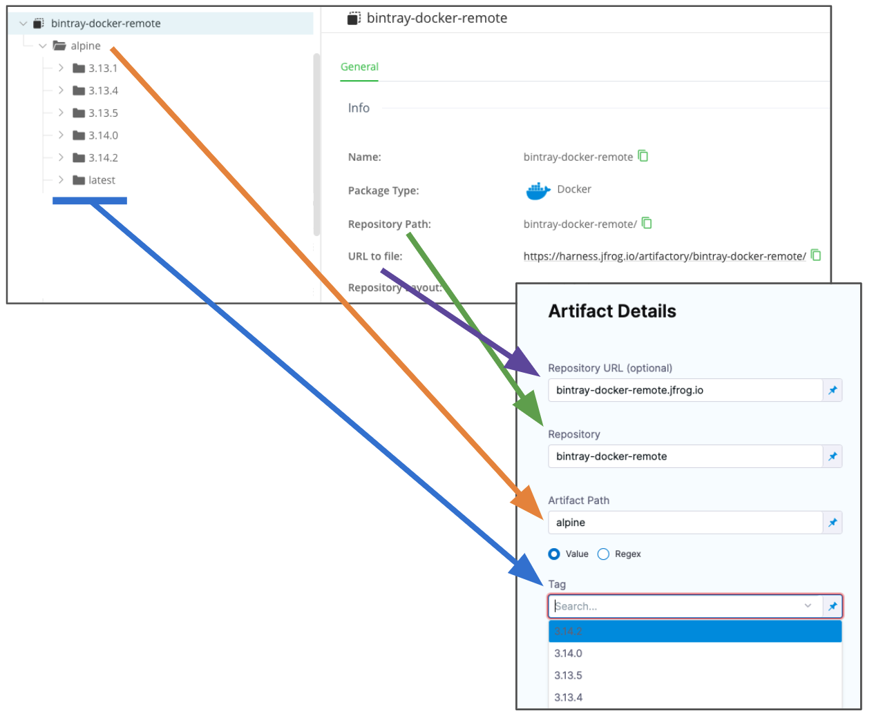 When you select the artifact repo for the artifact, like a Docker Hub repo, you specify the artifact and tag/version to use.