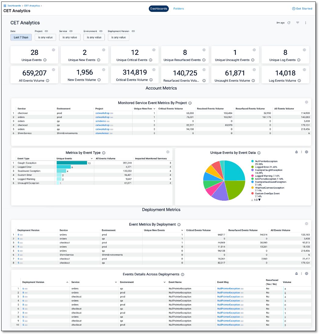 The CET Analytics dashboard provides comprehensive insights into event data across deployments and projects. The dashboard offers several key features to help you with effective error tracking and analysis: