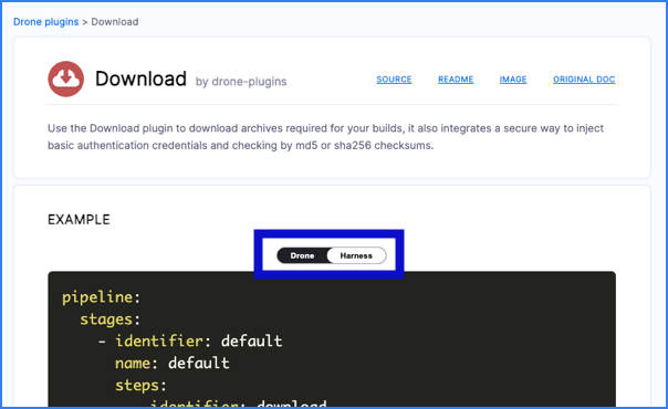 The YAML examples in the Drone Plugins Marketplace can help you configure settings for a Plugin step in Harness CI. Many plugins offer both Harness and standalone Drone YAML samples, as indicated by the Drone/Harness toggle in the Example section.