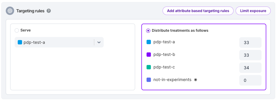 We create a parent feature flag named pdp_test_parent with four treatments, one for each of the experiments, as well as a not-in-experiments treatment. In this example, we use a percentage-based targeting rule to divide traffic, but you could also use attribute-based targeting rules.