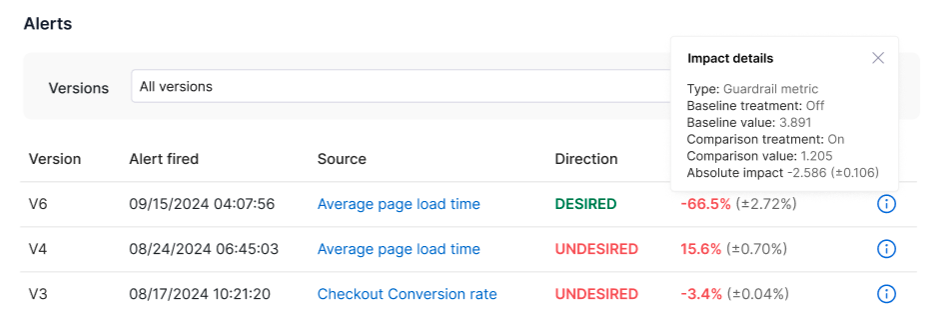 | Source | The name of the alert policy, key metric, or guardrail metric. Click the name to go directly to the policy or metric definition. |
