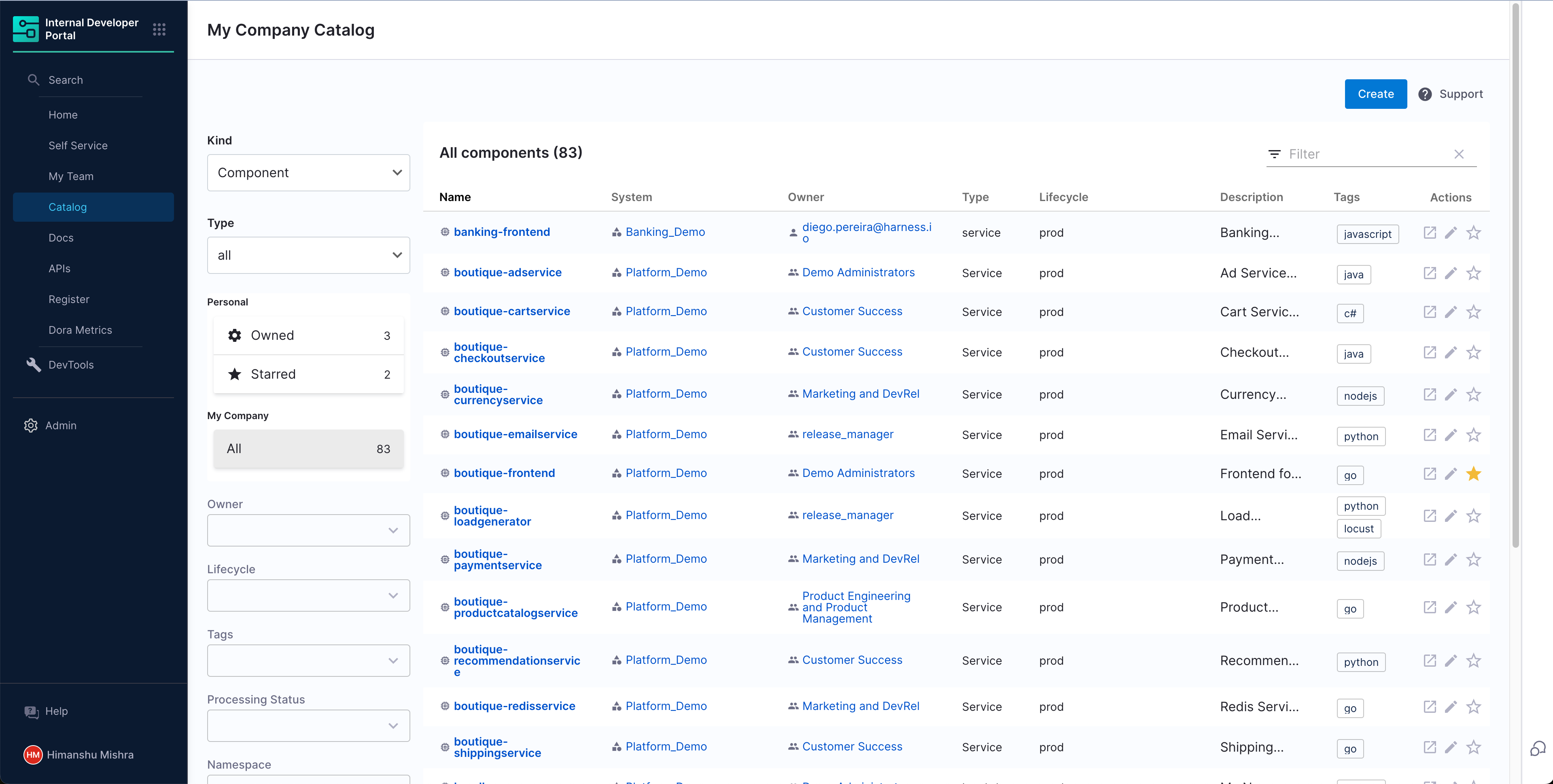 The software catalog is a centralized registry for all your software (services, websites, libraries, data pipelines, and so on), and it helps you track their ownership, metadata, and dependencies. The catalog is built from metadata YAML files, each of which is stored with its code and owned by a team. It is powered by the Backstage Software Catalog.