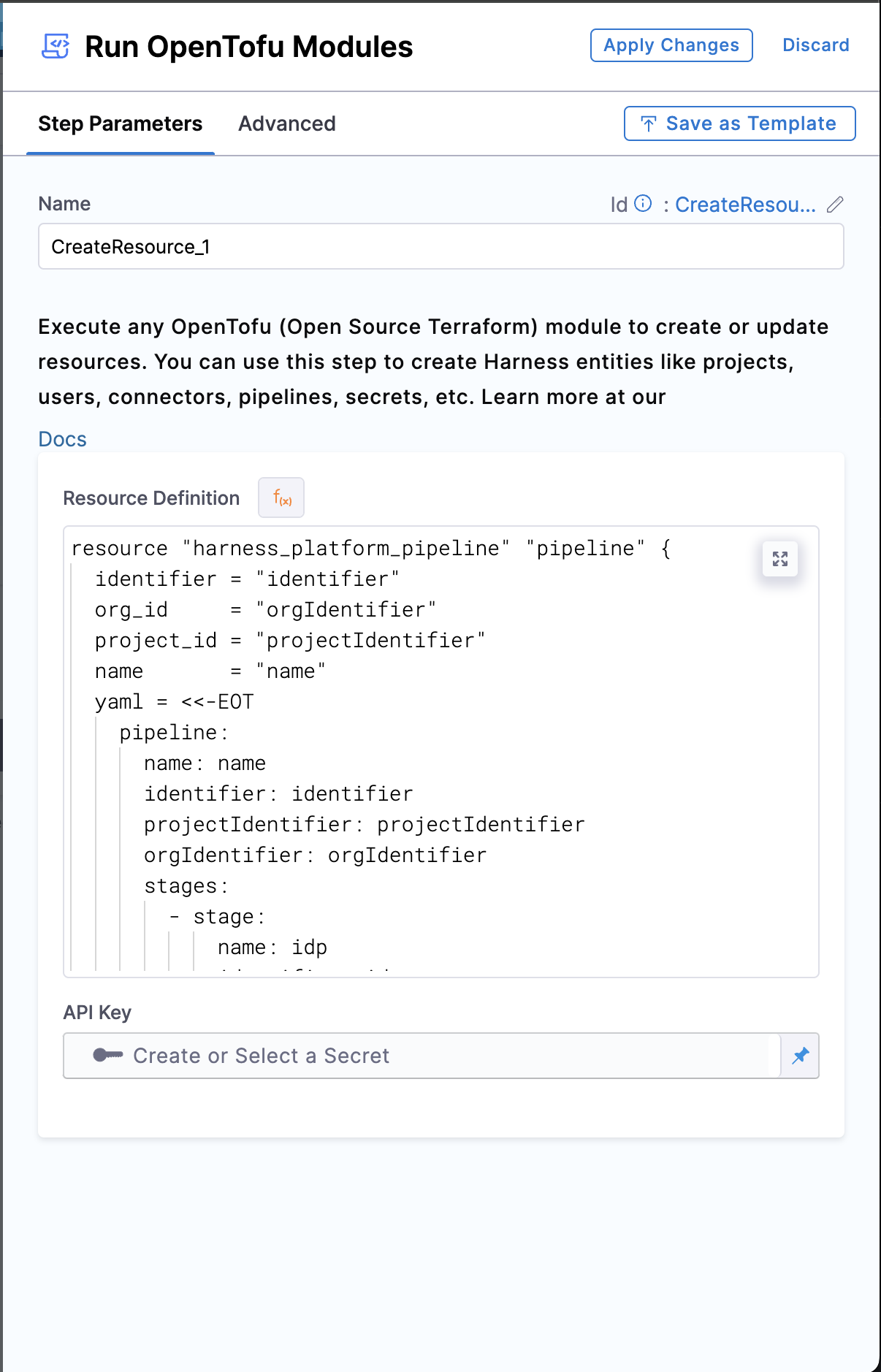 6. createResource: Used to create Harness entities like projects, users, connectors, pipelines, secrets, etc.