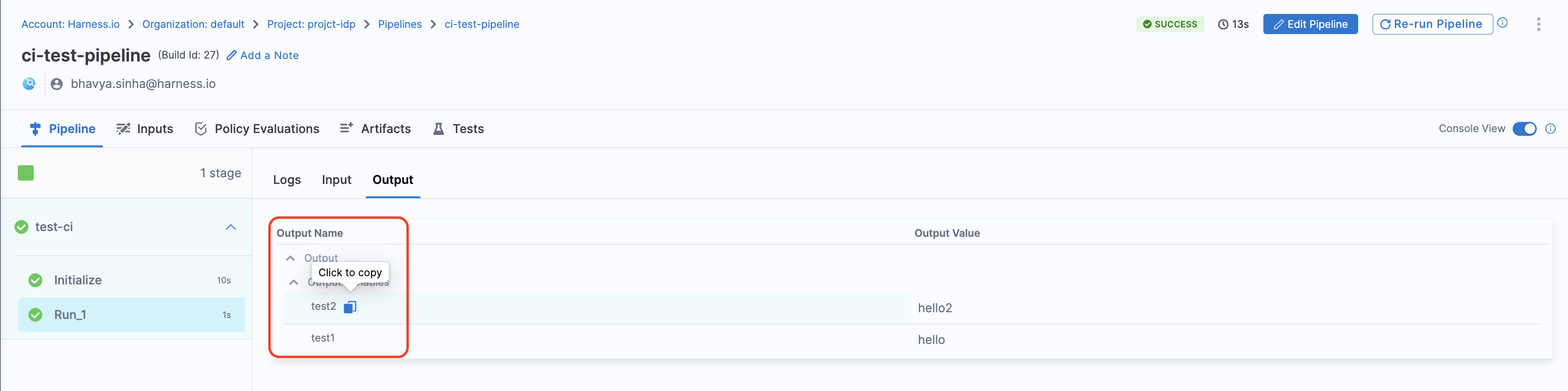 • In this case, pipeline.stages.testci.spec.execution.steps.Run_1.output.outputVariables.test1 is derived from: