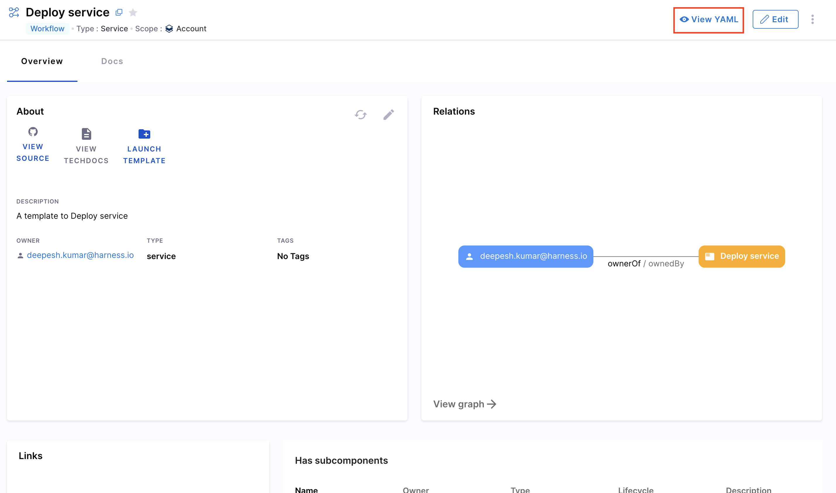 - From the Catalog, select the desired Workflow and click View YAML.