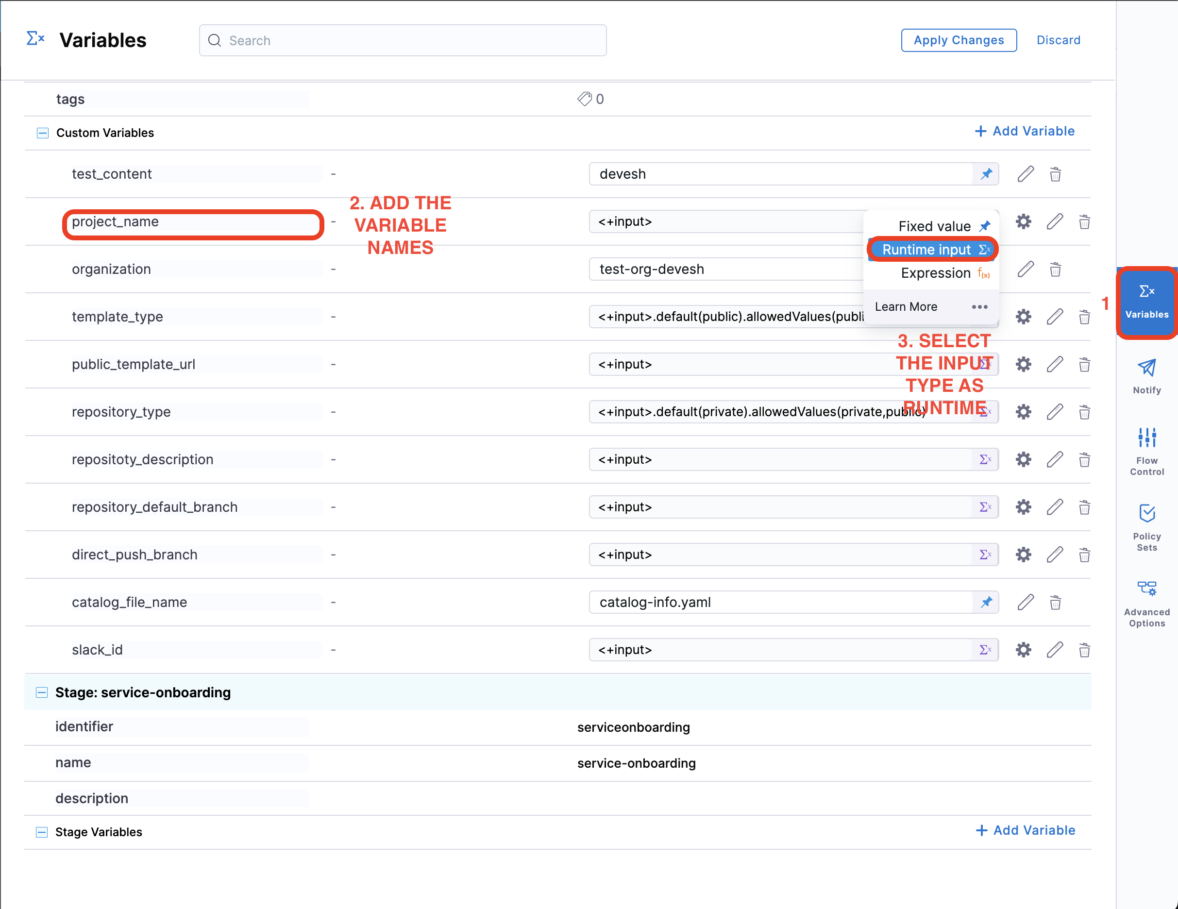 - Go to the variables and create all the variables whose values you're going to provide as runtime inputs using the workflows. Here's the list of variables you need to create, make sure you name them exactly the same as mentioned below as we use the same names in the workflows.