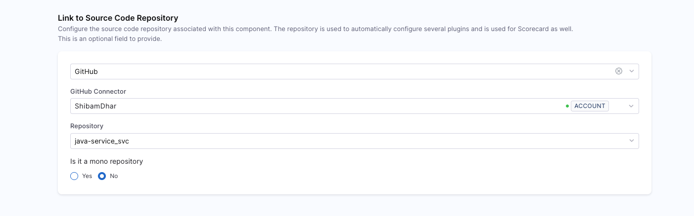 This field is optional, but strongly recommended if your component is tied to a Git-based workflow or needs source-aware plugins. For more details about source code repository configuration options including mono repositories and supported providers, see Working with YAML in Harness IDP UI.
