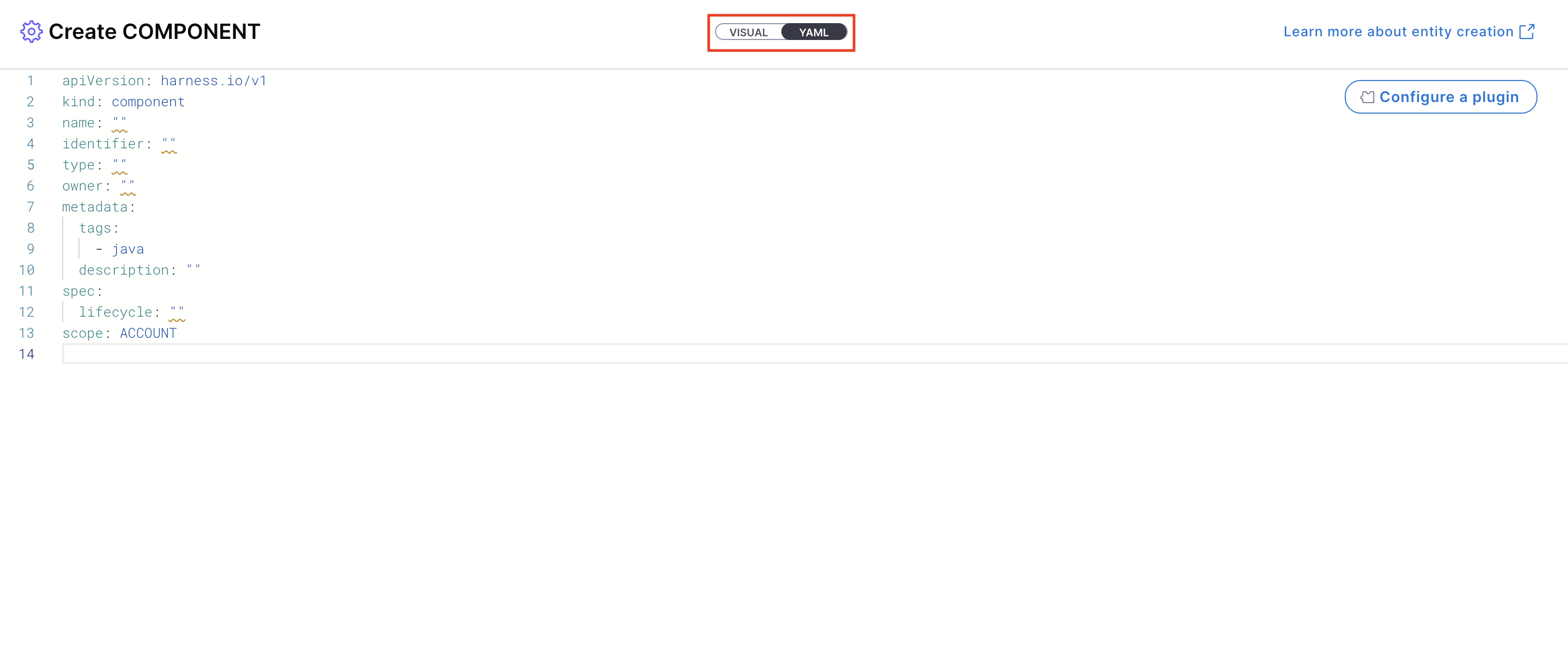 - Create an entity via the Harness IDP UI: Use the Harness UI to create entities directly—no YAML required. This method offers a streamlined, code-free experience for adding entities.