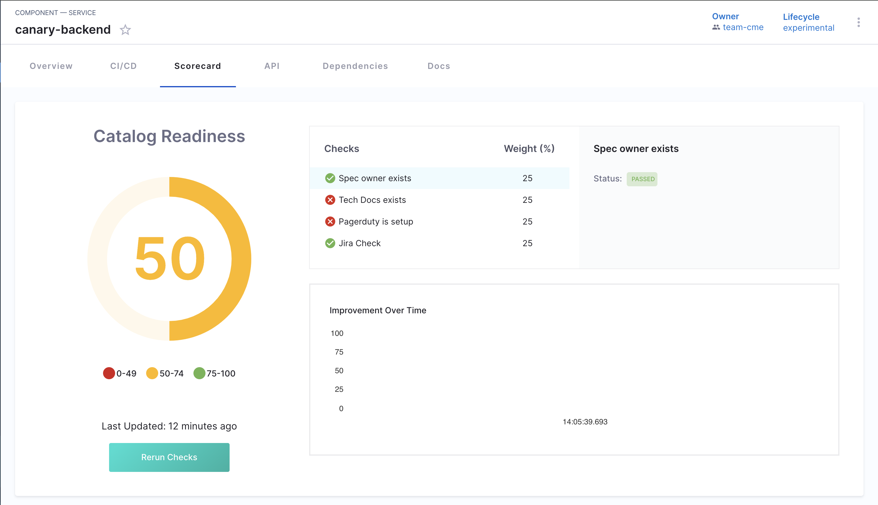 With your catalog populated with software components and plugins enabled, it's time to create a scorecard. Using the catalog datasource, you can monitor the existence of essential root fields and integrations defined through annotations in the catalog-info.yaml metadata. Tracking this information within the catalog helps to enforce organizational engineering standards.