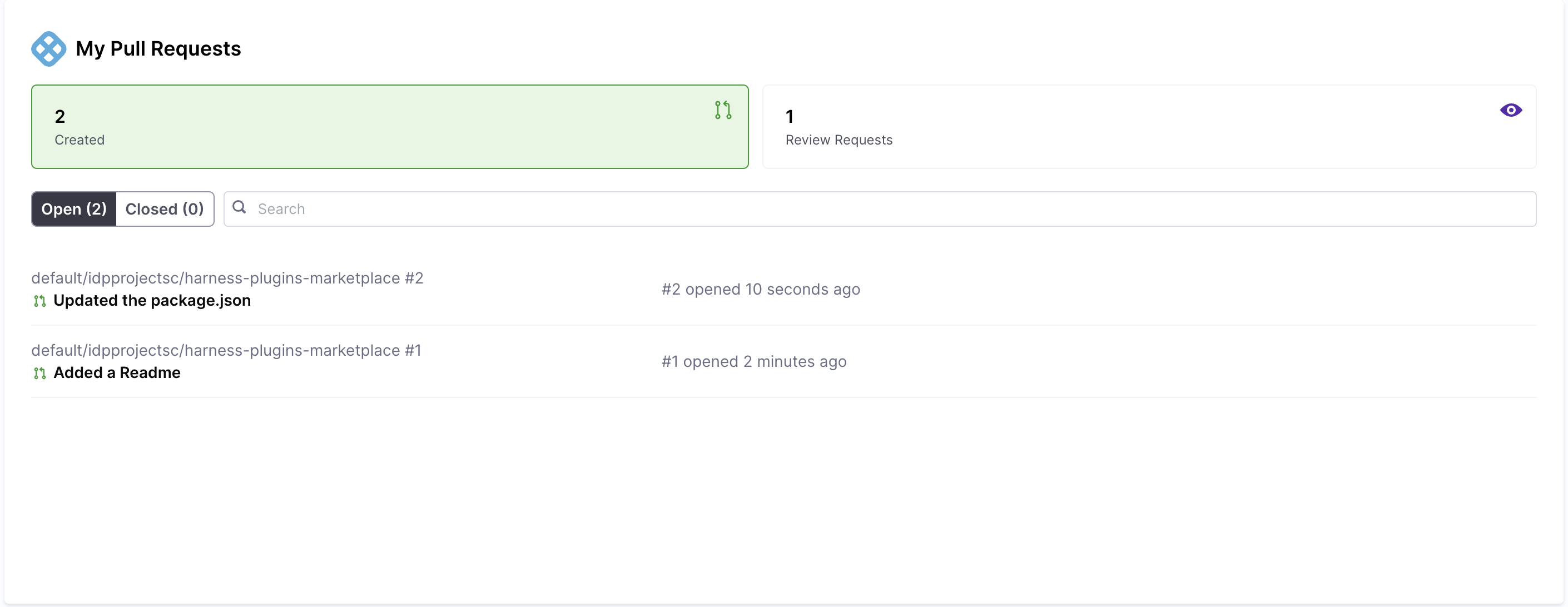 The Harness Code Repo (HCR) Pull Request Card provides a quick overview of pull requests related to your work. It consolidates PRs from all repositories you have access to, whether public or private, across multiple organizations. Unlike other integrations, the HCR Pull Request Card does not require any additional setup. Once enabled on your Developer Homepage, it seamlessly fetches PR data from the Harness Code Repo without any external sign-in or configuration steps.