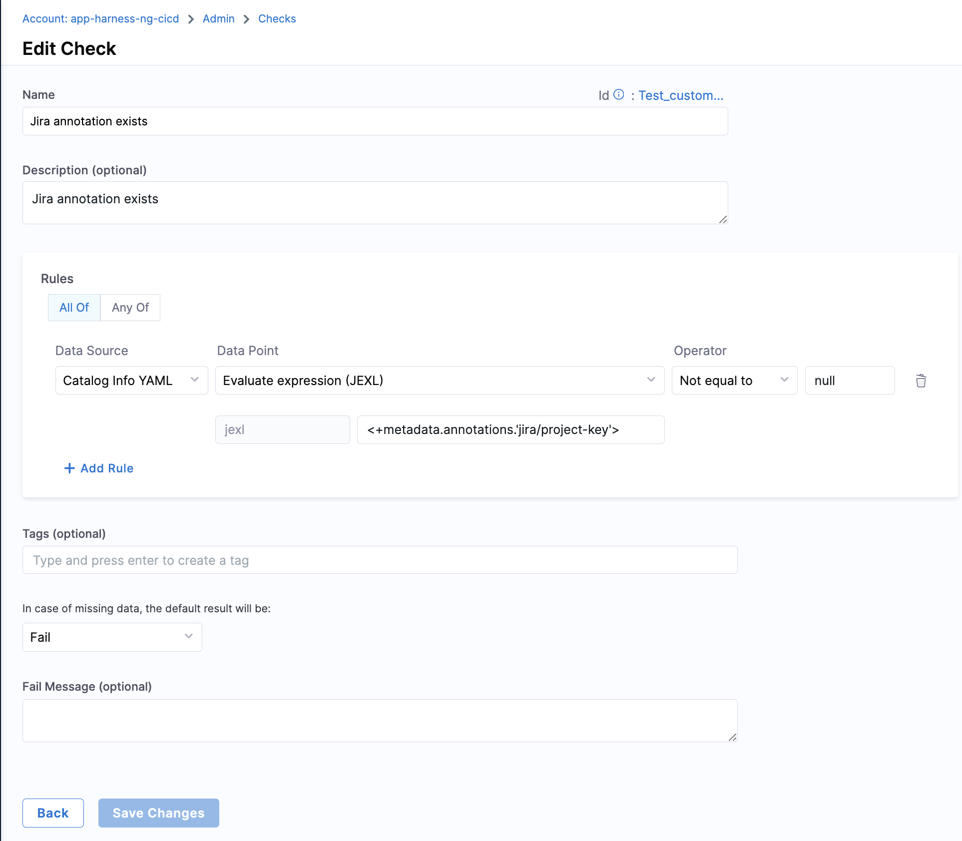For example, setting up the check below for the example catalog-info.yaml you could find whether the annotation jira/project-keypresent or not. In this case the check would pass as the annotation is present.