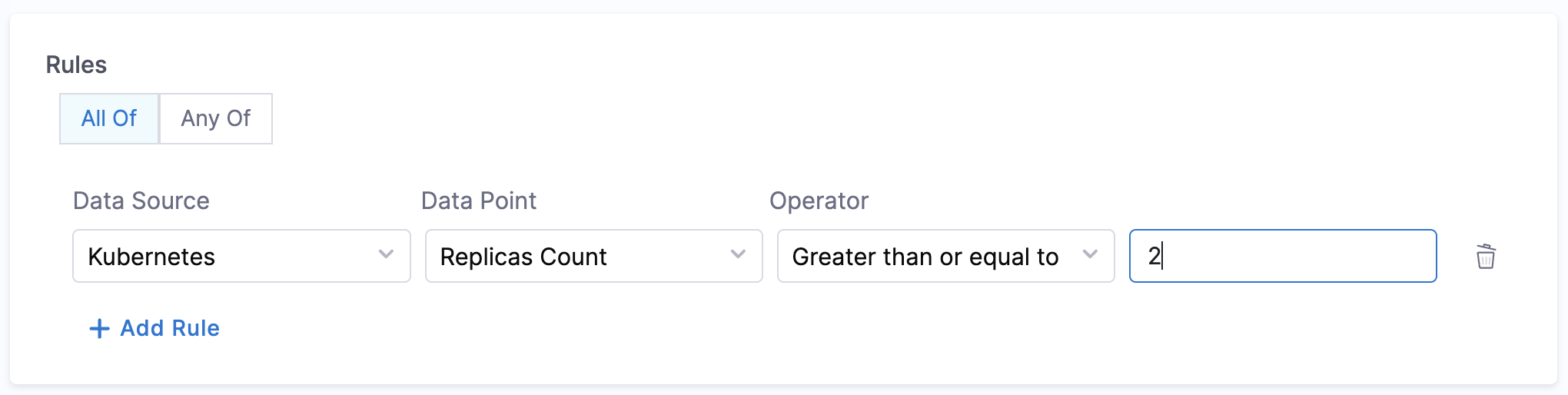 - Calculation Method: The label selector configured in the catalog YAML is used to identify the Kubernetes workload and the configured replica count is used. The cluster details configured in the Kubernetes plugin are used. If more than one cluster is configured, the workload search is done in each cluster and a minimum of all the replica counts is taken into consideration.