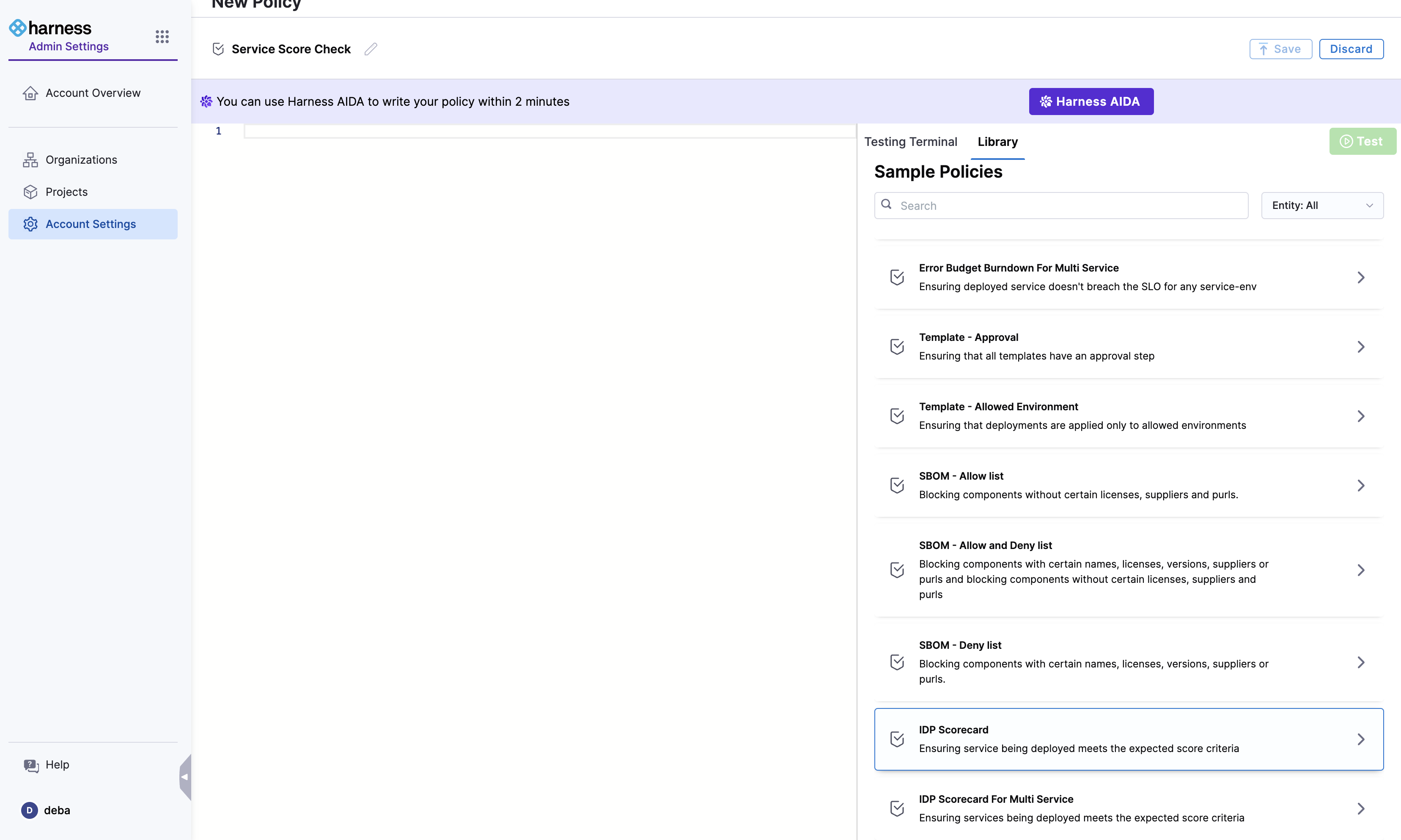 In this tutorial we will look into how you can create the policy and apply it to all Services in your Account. The policy is evaluated on Service-level based on the score fetched from scorecards and the conditions set by users, and applues on pipeline-event like On Save which occurs during Connector Creation and Updates. Go to Harness Governance Quickstart.