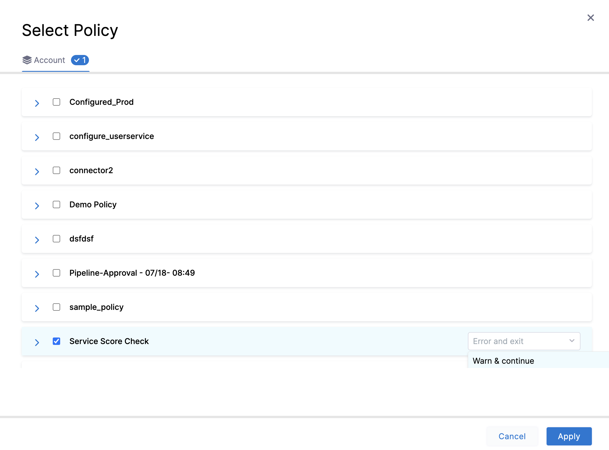 1. Now add the policy you have created above and change the type to Warn & Continue and Apply.