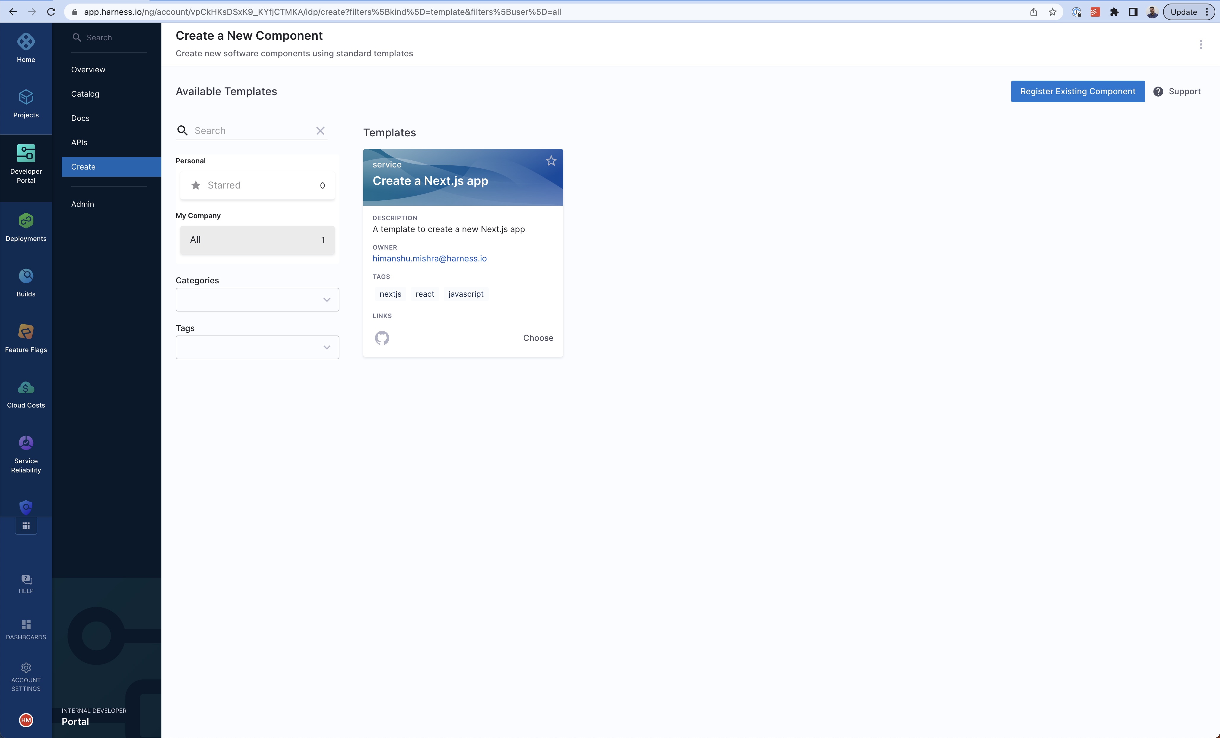 This tutorial is designed to help a platform engineer to get started with Harness IDP. We will create a basic service onboarding pipeline that uses a software template and provisions a Next.js application for a developer. After you create the software template, developers can choose the template on the Create page and enter details such as a name for the application and the path to their Git repository. The service onboarding pipeline creates a hello world repository for storing code.