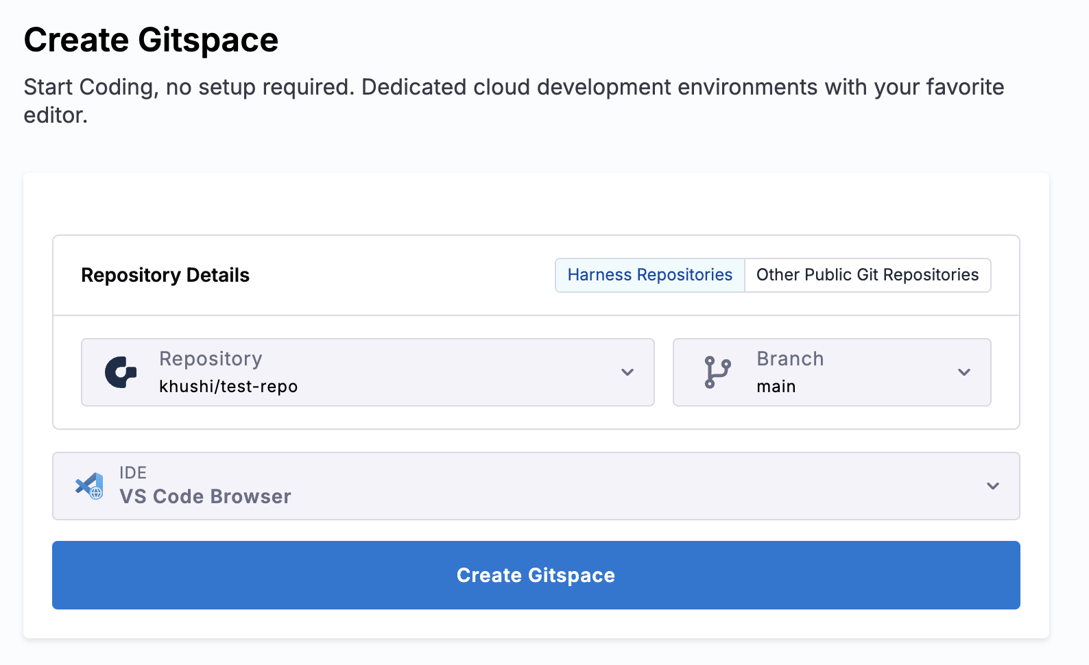You can start by creating a new Gitspace from the Harness Open Source UI. (check the quickstart guide for more details) Please ensure that while creating one, you choose “VS Code Browser” as the selected IDE.