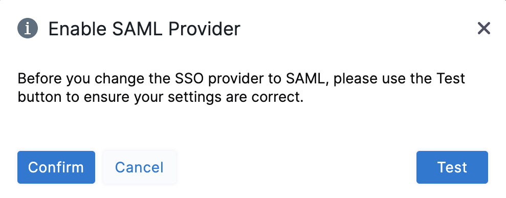 - In the resulting Enable SAML Provider dialog, click TEST to verify the SAML connection you've configured.
