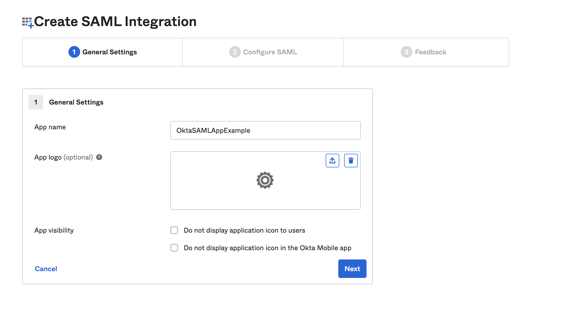 - Enter a Name for the SAML configuration, and select Okta.