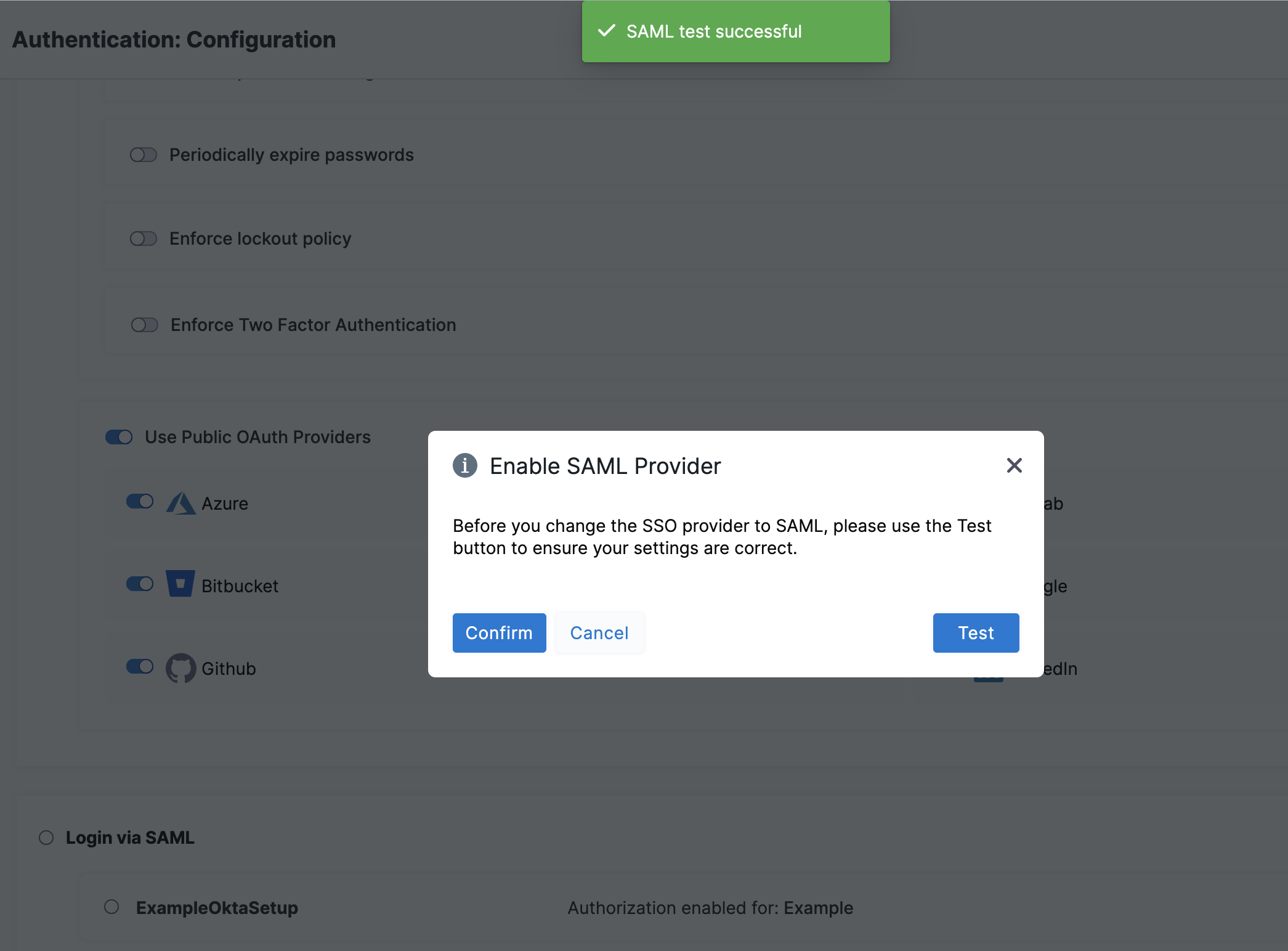On the Enable SAML Provider confirmation window, select Test to verify the connection. A new browser tab opens where you need to log in to Okta.