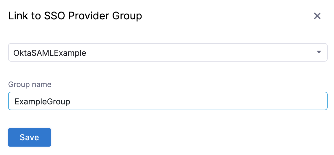 In the Link to SSO Provider Group dialog, in Search SSO Settings, select the SAML SSO Provider you have set up.