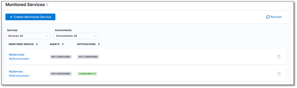4. Select Save. The monitored service is created and appears in the list of existing monitored services.