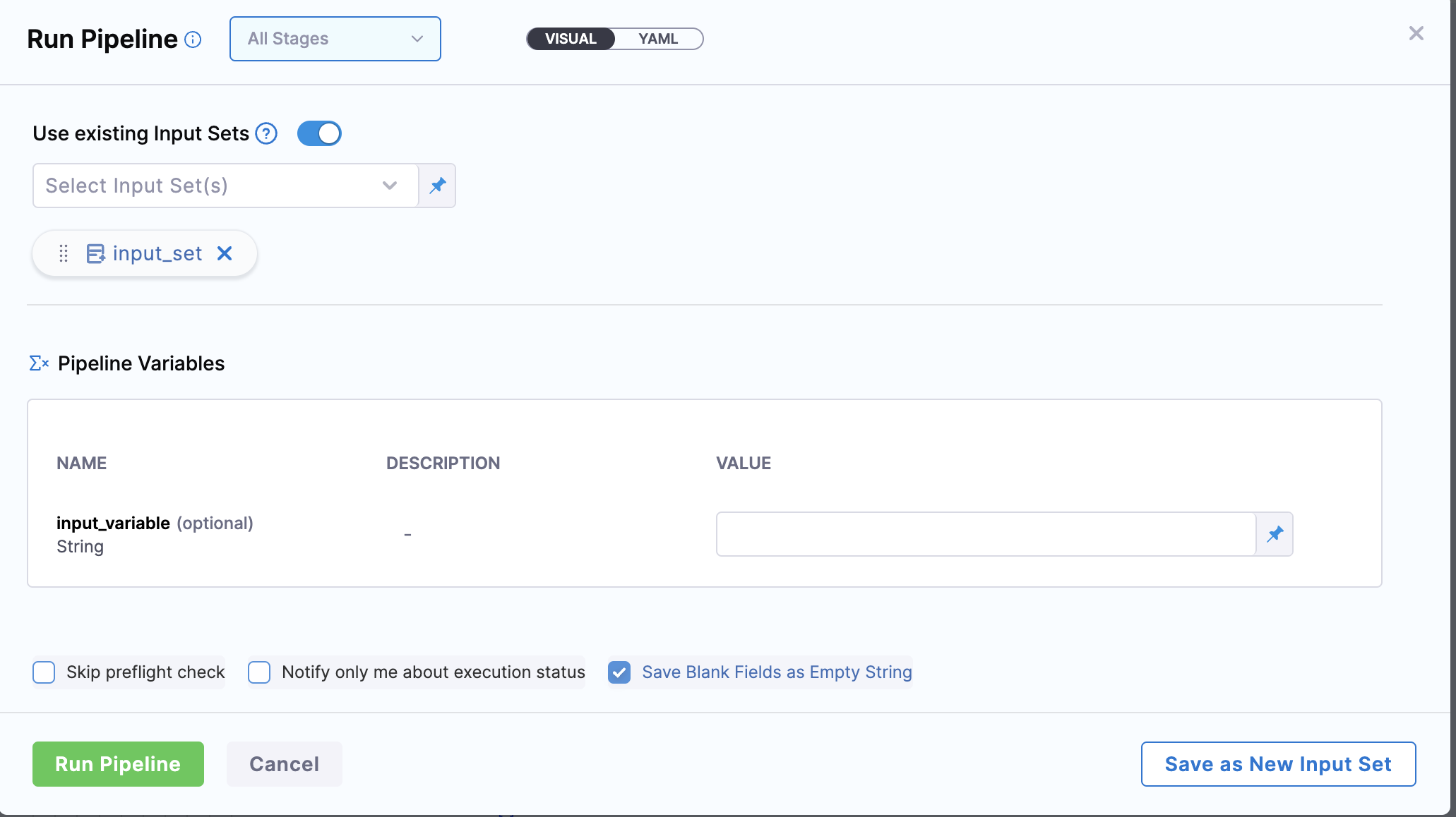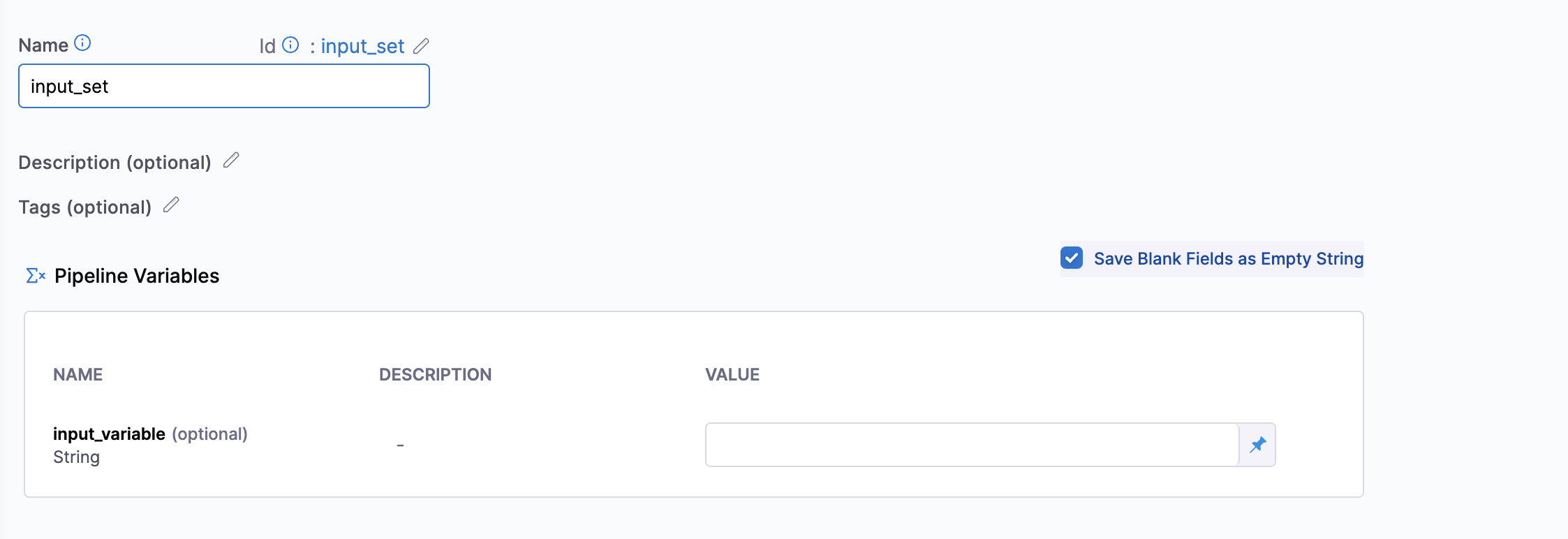 We have an input set created as well for this pipeline where we have left the value of input_variable as empty. Example yaml:-