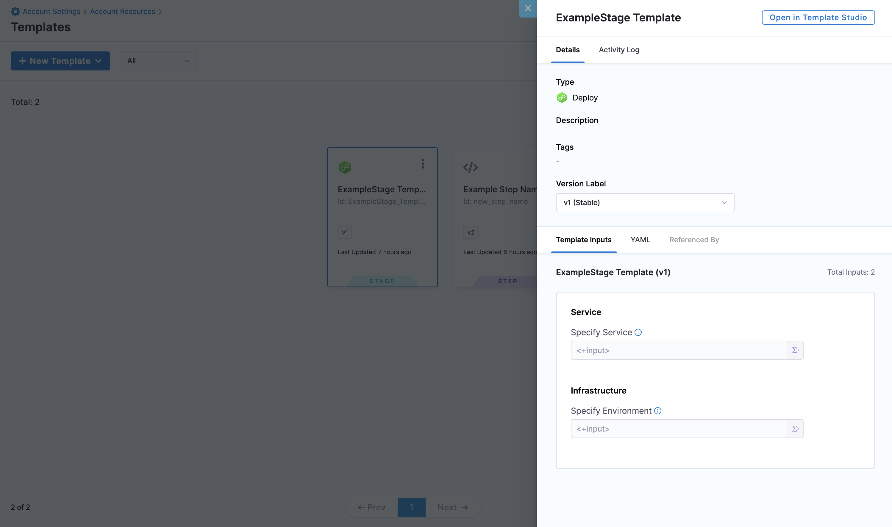 For example, if you create an account-level stage deploy template, the service, the environment, the infrastructure definition, the connectors, and the secrets referenced in its steps must be defined at the account level in order to be referenced as a fixed value or expression in the template.