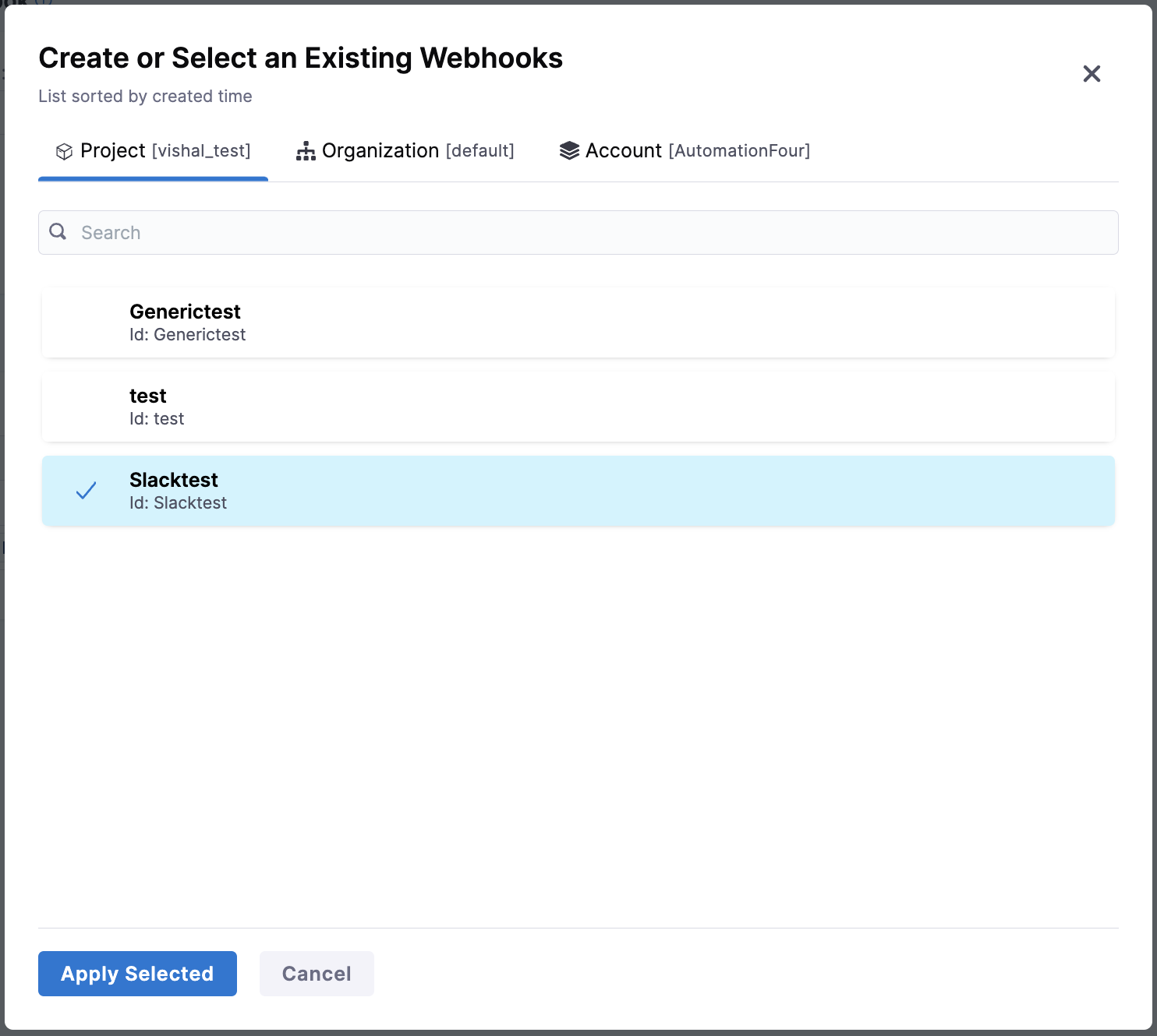 - Under Listen on New Webhook, Event Relay is selected by default for Payload Type. When selecting Webhooks, a pop-up page will display all the configured Generic and Slack webhooks.