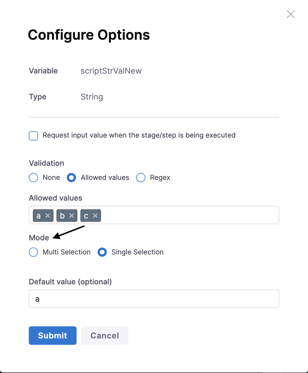 <+input>.allowedValues(value1,value2).default(value1).executionInput()