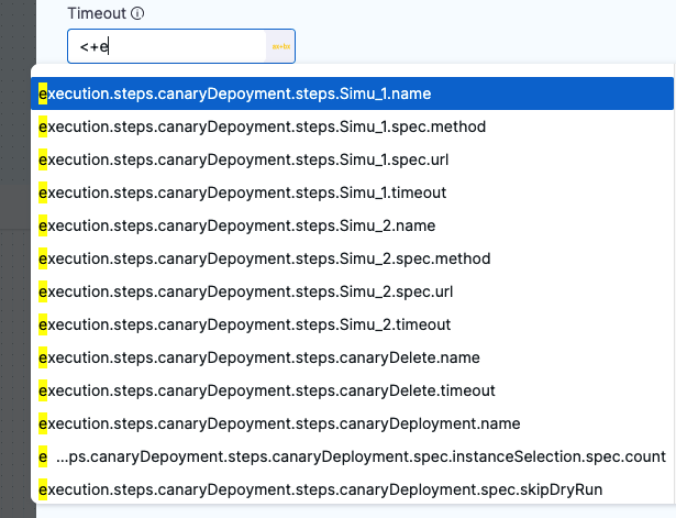 When you type <+, Harness provides suggestions for built-in expressions as you type. You can manually trigger the suggestions by placing your cursor after <+ and pressing ctrl + space. These suggestions don't represent all possible expressions.