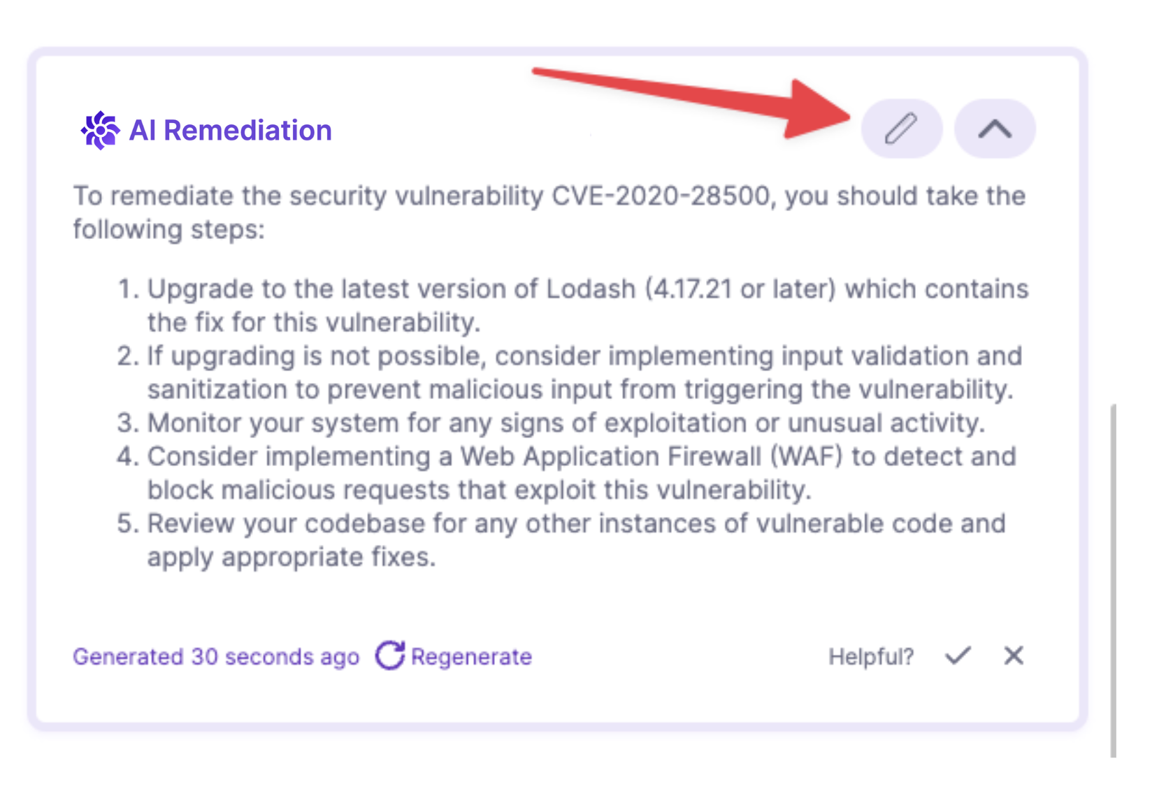 - Edit Remediation: You can modify the AI suggestions and regenerate improved, context-specific advice tailored to the issue.