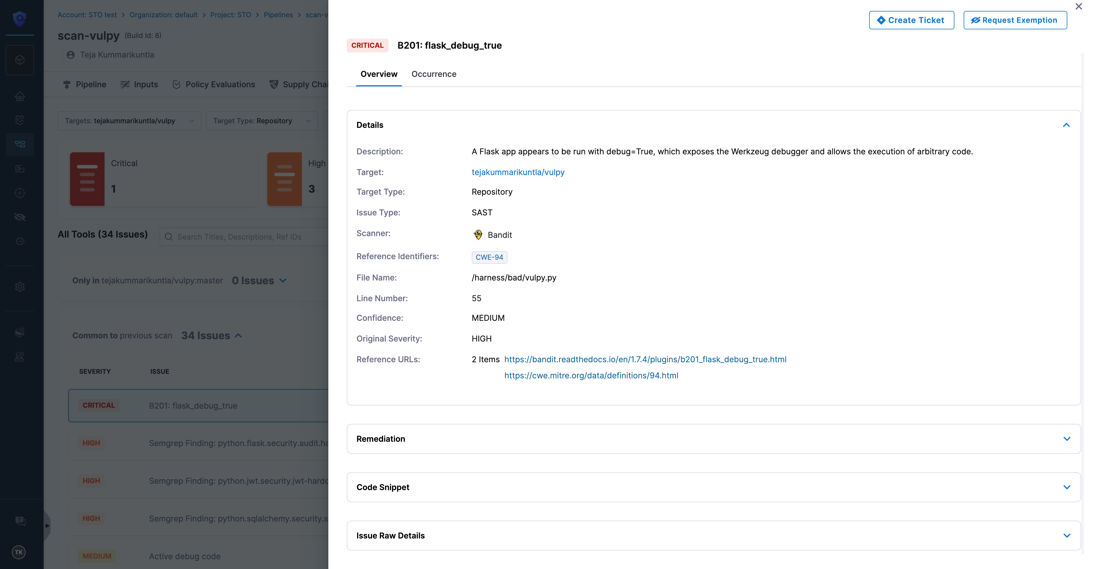 Remediation: Remediation steps from Harness AI and Scanner. If scanning a repository, you can raise PRs or get code suggestions from Harness AI (see Fix security issues using Harness AI).