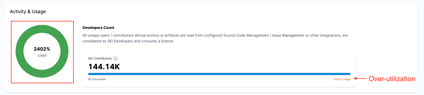 The Activity & usage section provides real-time data on how many Developer licenses are being utilized. An unexpectedly high number of active contributors compared to the allocated licenses might indicate issues like duplicate records.