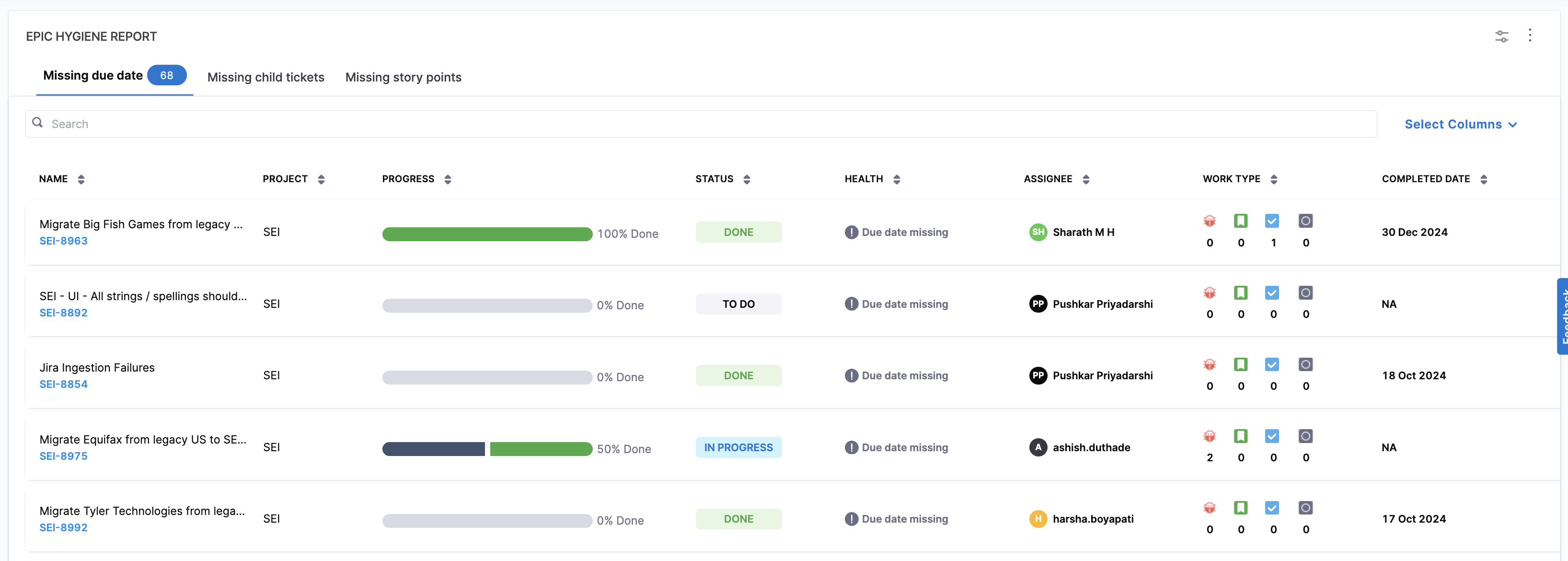 - Disorganized work: Epics without child tickets make it difficult to measure work breakdown.