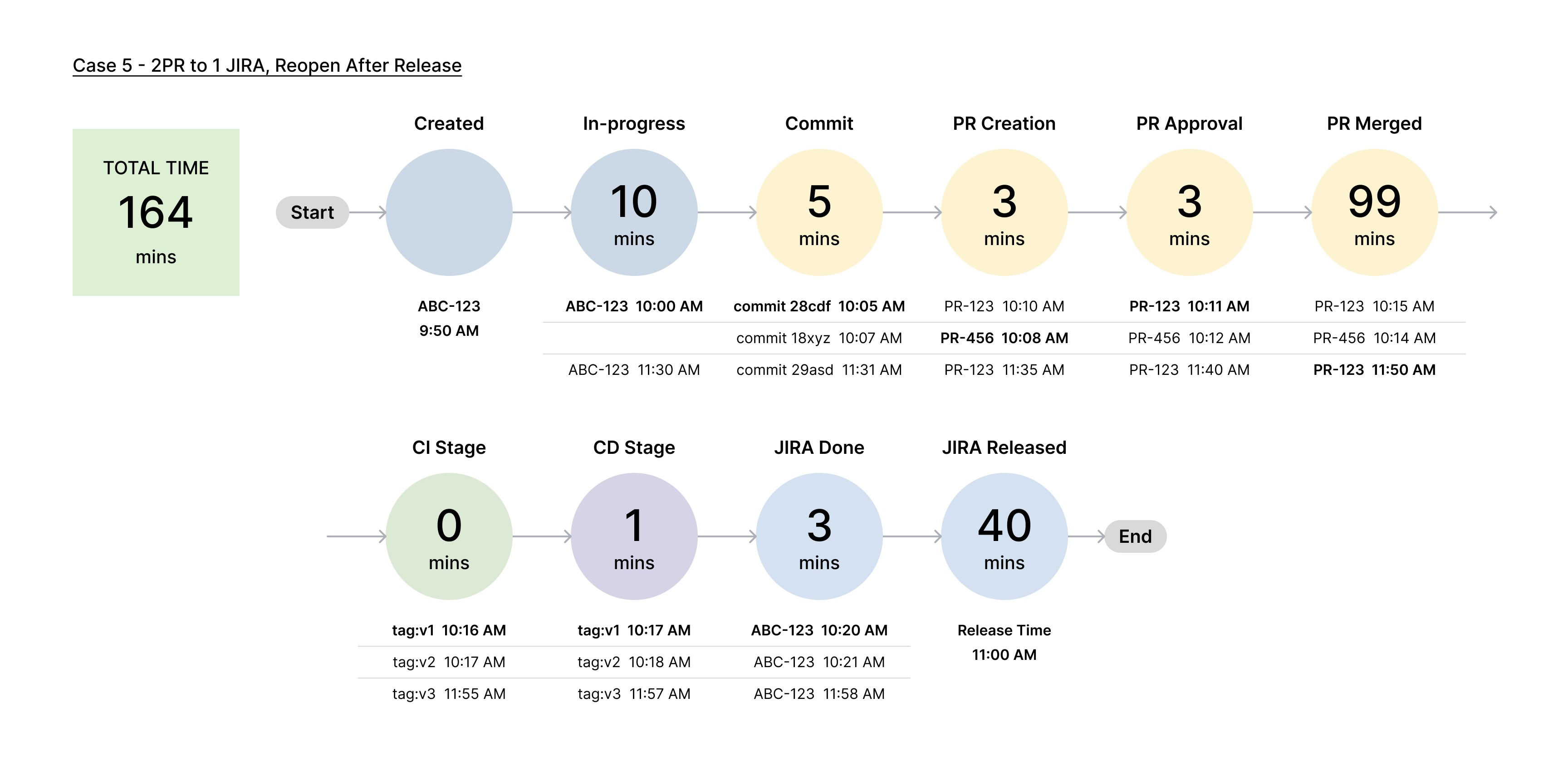 Calculation Example 5 - Two PRs associated with a Single Jira Ticket and Jira Ticket was re-opened after Release