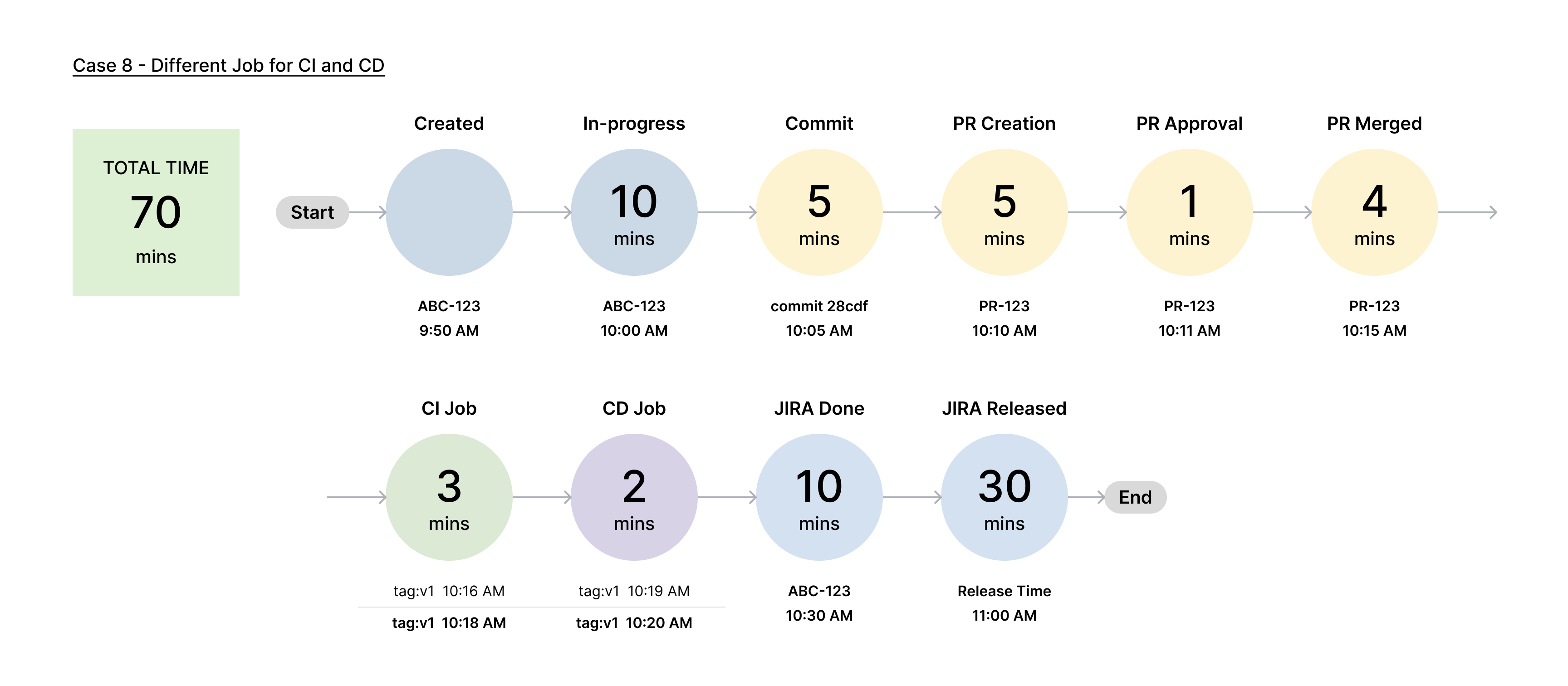 In this case, a single job handles both the CI and CD processes, so the First CI and CD Completion Time stage represents the time taken for this single job to complete both processes. The First Issue Management Done Time is zero because the issue is marked as Done immediately after the CI and CD processes are completed by this single job.